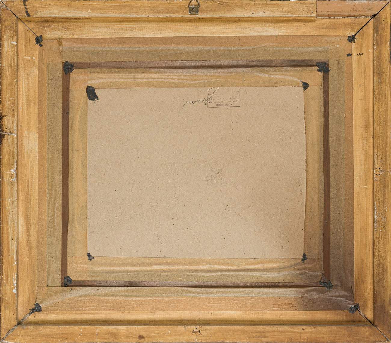 Timbro della Galleria La Scaletta (RE) al retro del cartone protettivo