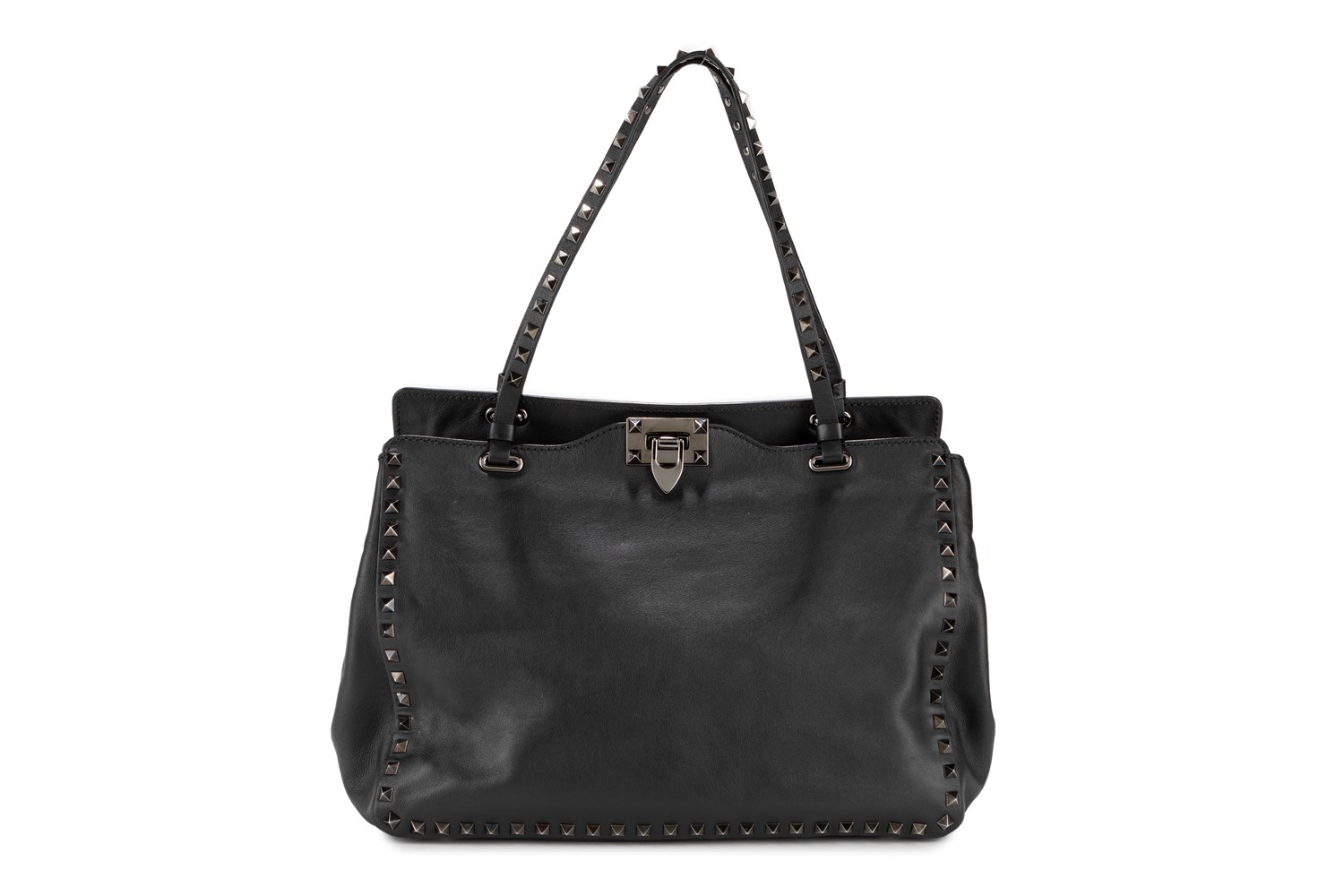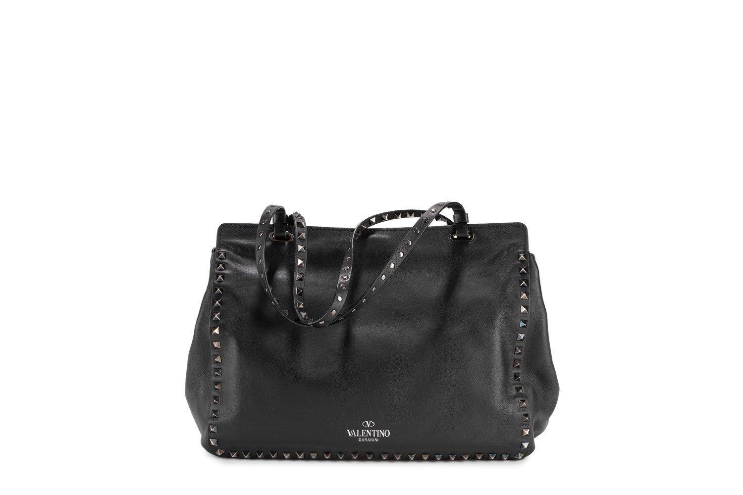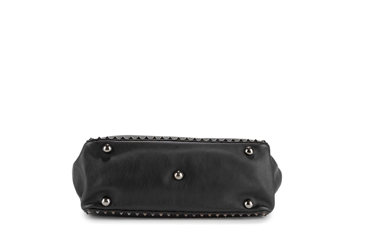in pelle color nero, doppi manici con tracolla staccabile, applicazioni di borchie metalliche, cm 33, con sacchetto (lievissimi difetti).