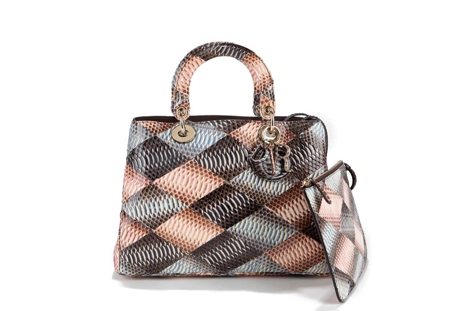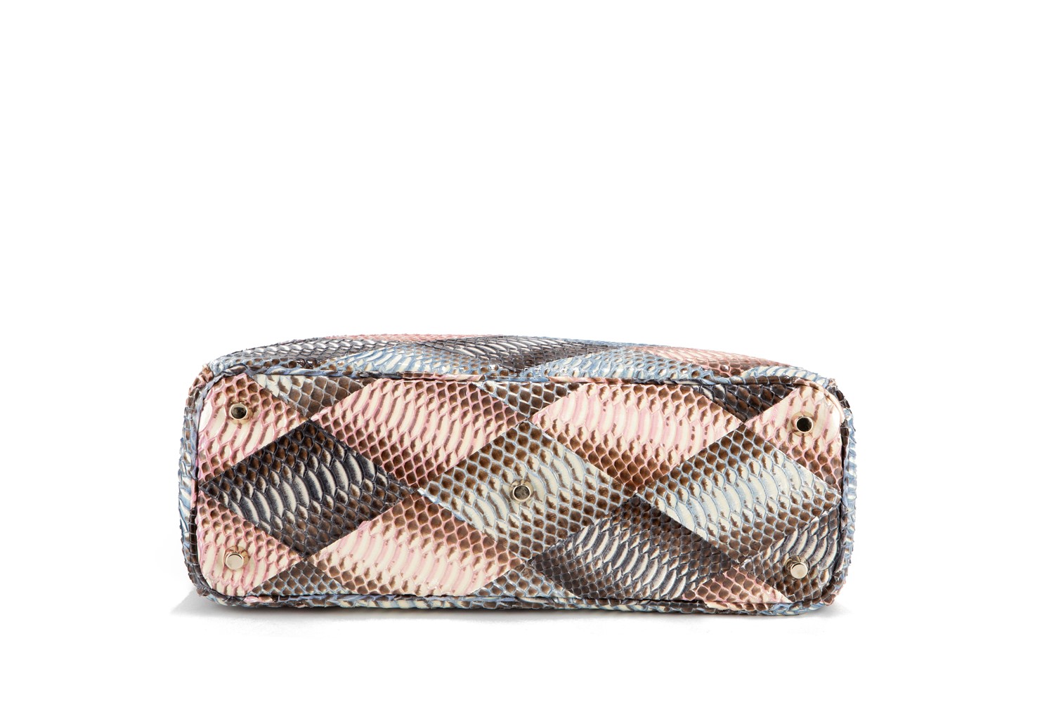 in pelle di pitone patchwork, colori vari, doppi manici, con tracolla staccabile e busta interna, dettagli in metallo, cm 32, con sacchetto e scatola (lievissimi difetti).