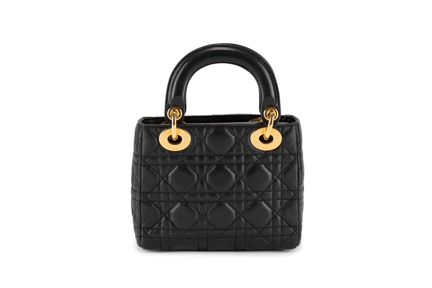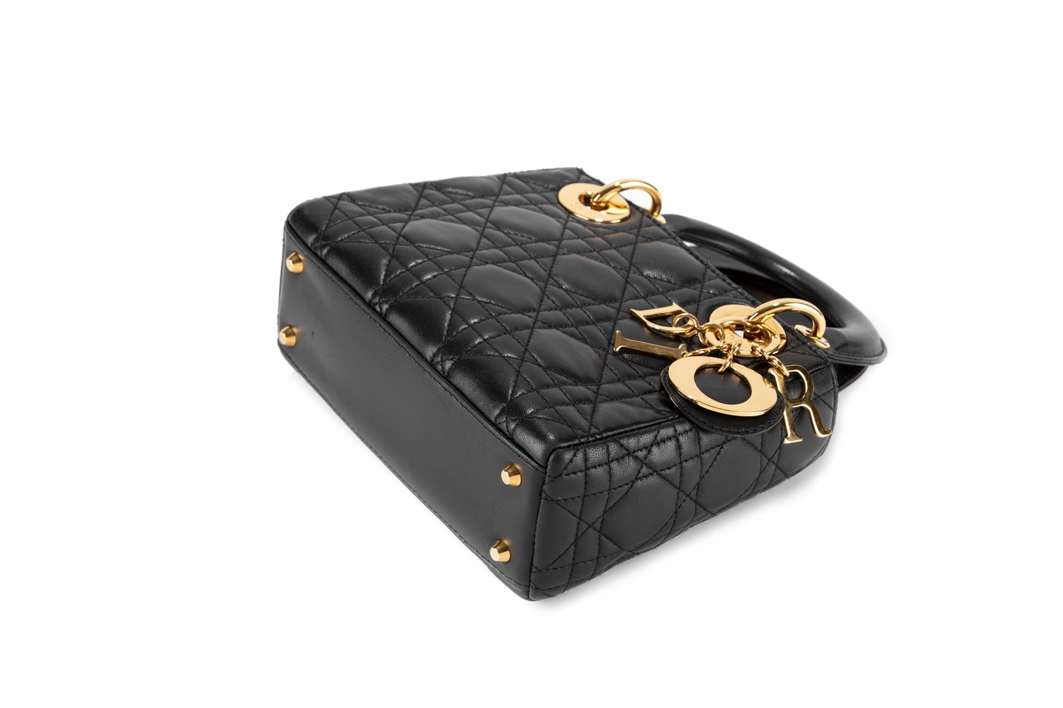 in pelle cannage color nero, doppi manici, con tracolla staccabile, cm 18, dettagli in metallo dorato (lievissimi difetti).
