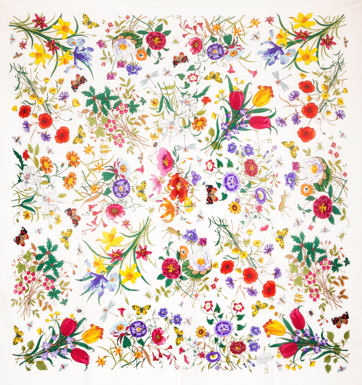 in seta stampa colori vari su fondo color panna, cm 140x140 (lievi difetti).