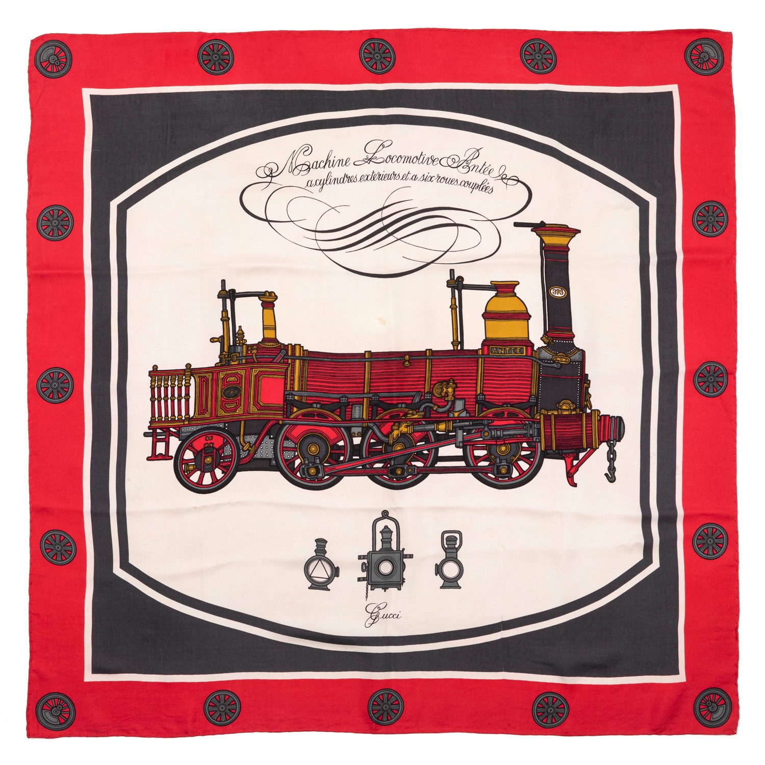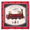 in seta color bianco, grigio e rosso raffigurante una locomotiva (difetti).