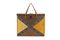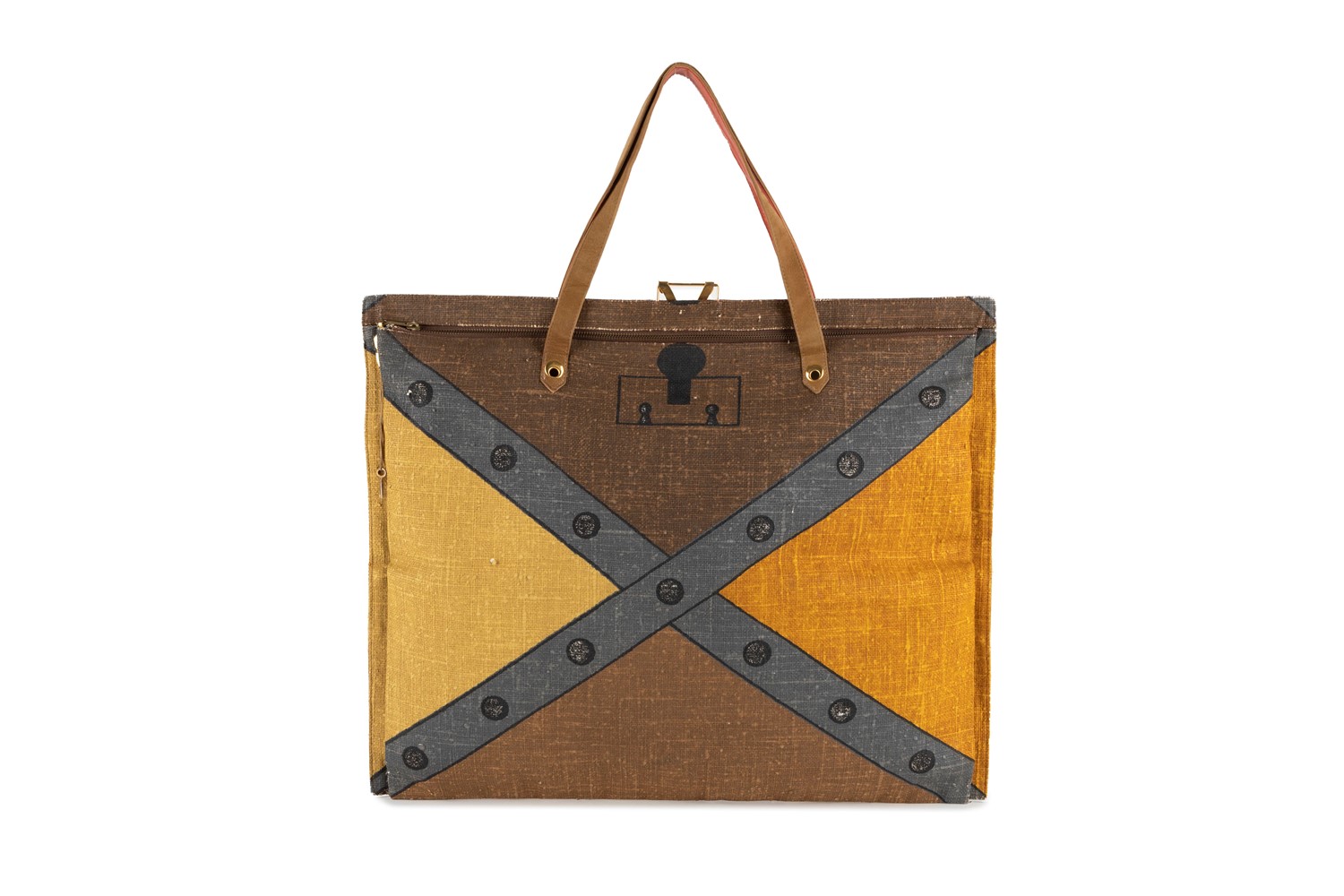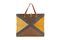 in tela stampata e motivo geometrico in colori vari, dettagli in metallo dorato, doppi manici in pelle bicolore, cm 58 (lievi difetti), anni '70
