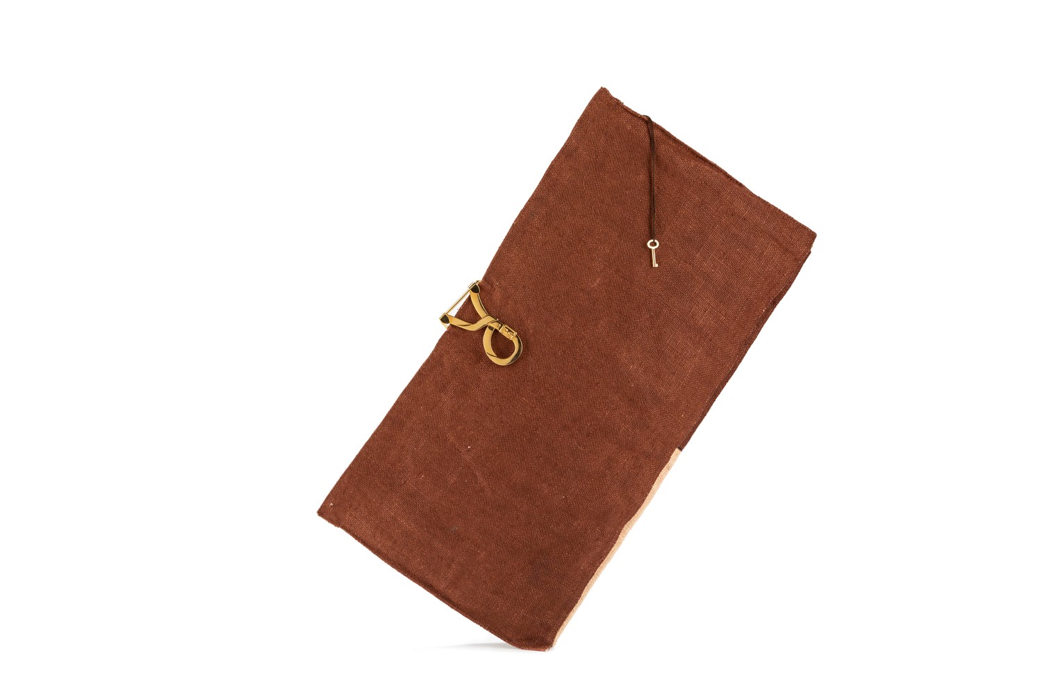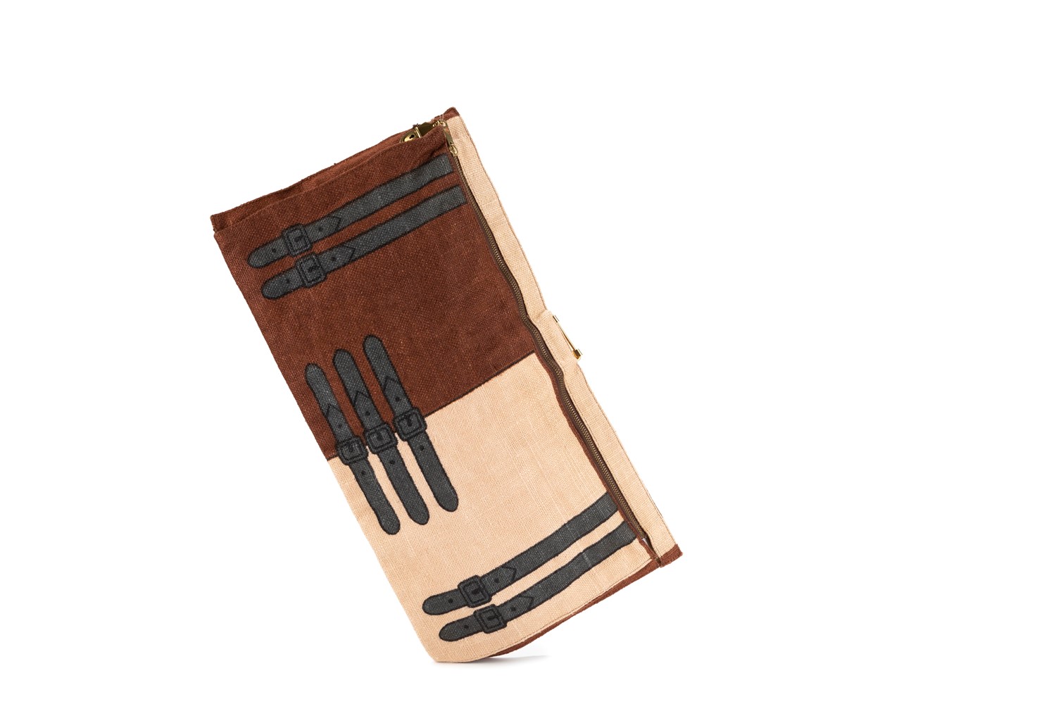 in tela stampata, con chiusura a cerniera, tonalità beige e marrone, dettagli in metallo dorato, cm 52 (lievi difetti), anni' 70