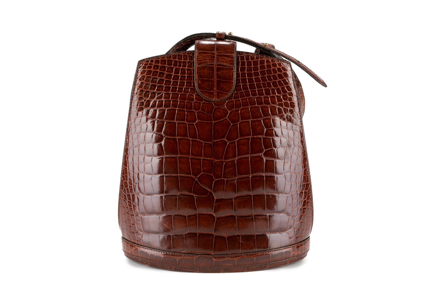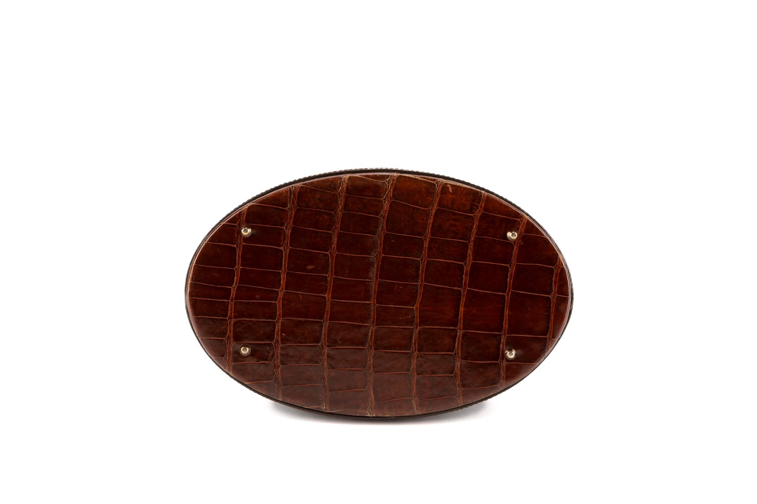 in pelle di coccodrillo color marrone, base ovale, con tracolla, dettagli in metallo dorato, cm 26x30 (lievi difetti).