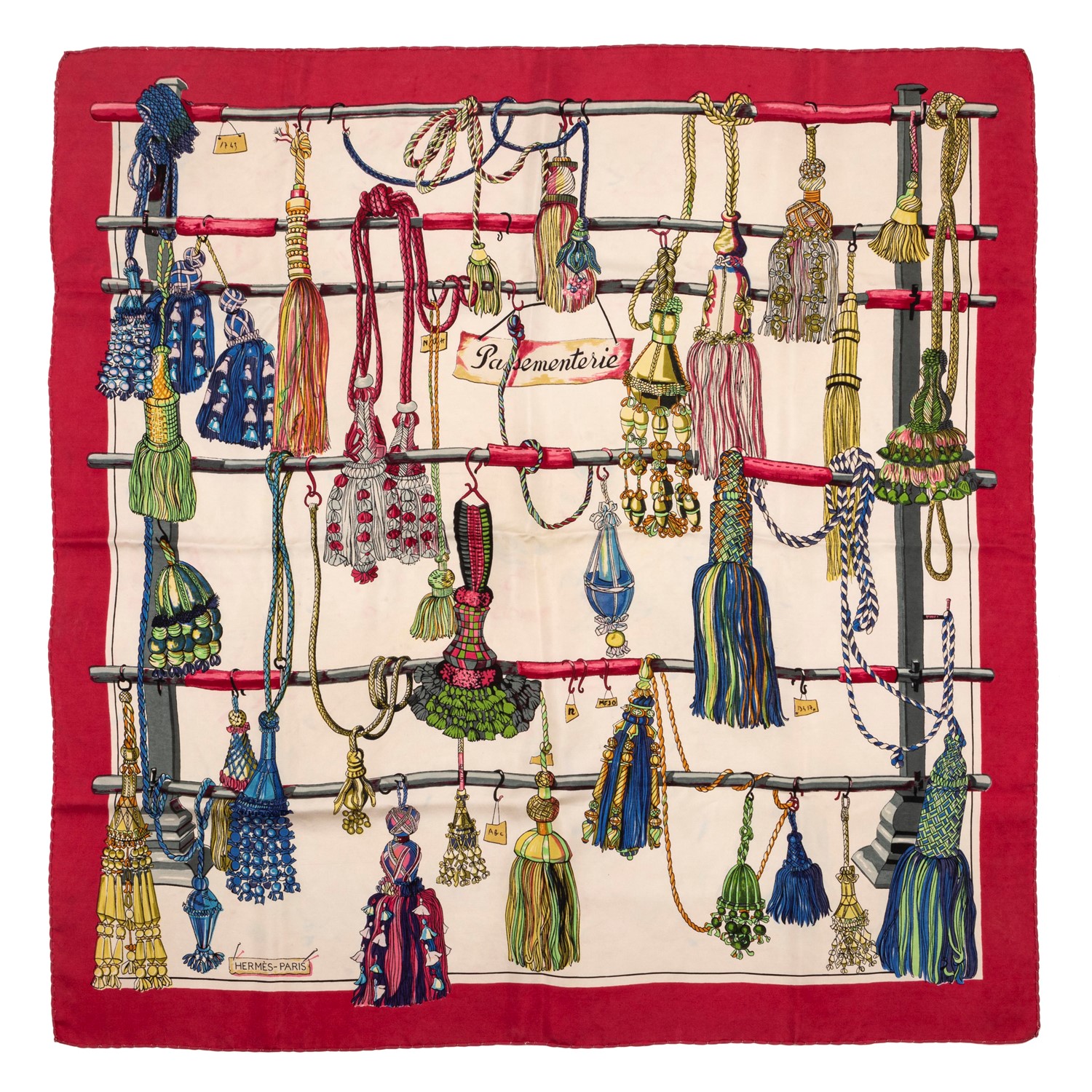 in seta su fondo color panna, bordo colo lampone, Marie Francoise Héron (difetti).