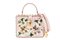 in pelle color rosa stampa a fiori in colori vari, applicazioni di strass multicolor e fiori in resina, profili con borchie stondate in metallo dorato, con tracolla staccabile e sacchetto, cm 19, nuova mai usata.