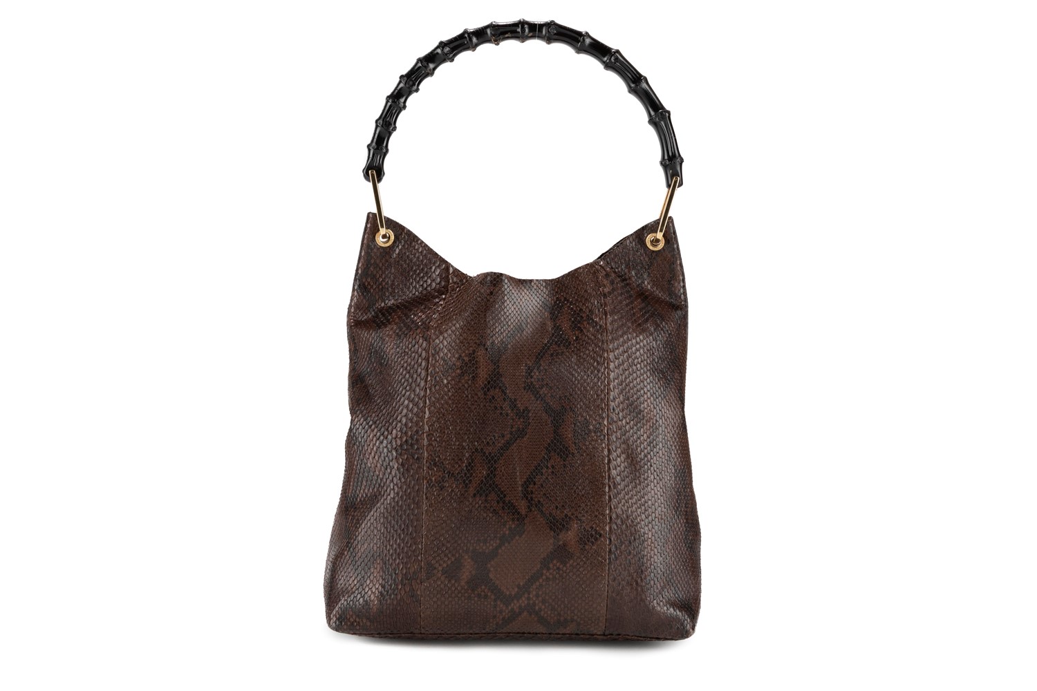 in pelle di pitone color marrone, manico in bamboo, dettagli in metallo dorato, bustina interna, cm 28 (lievi difetti).