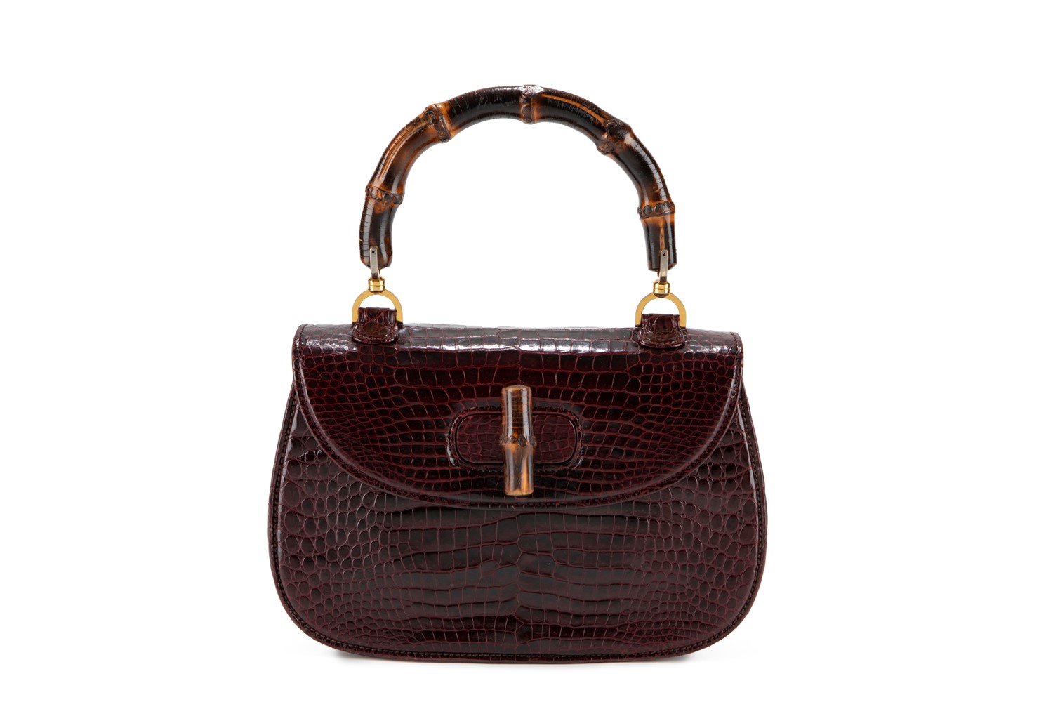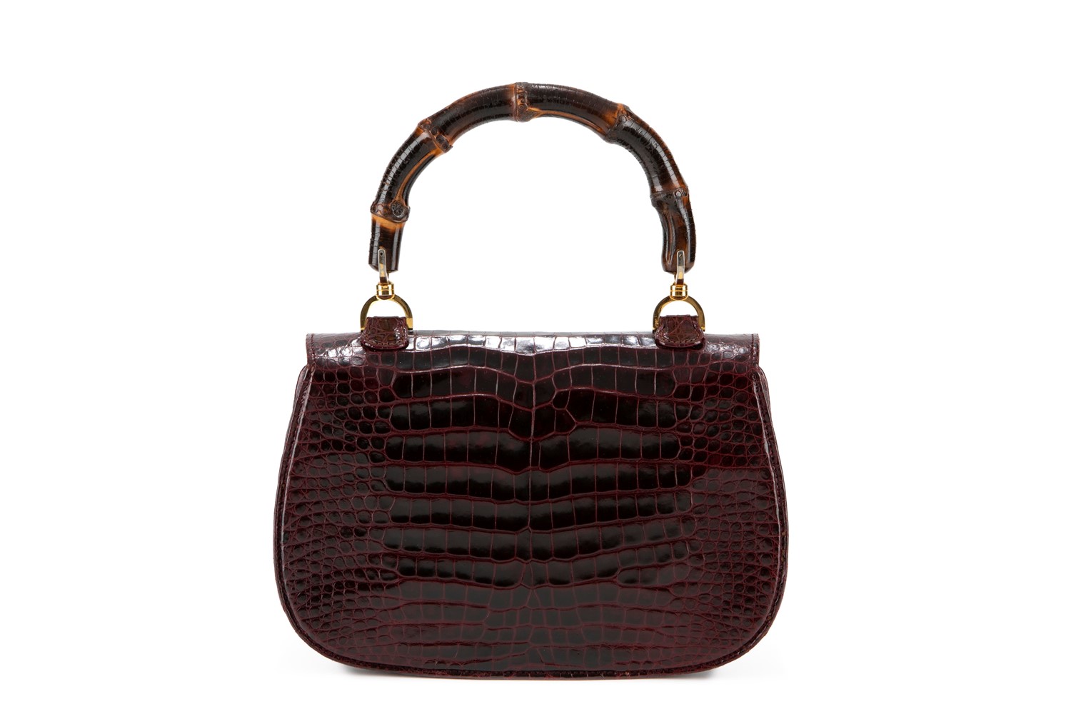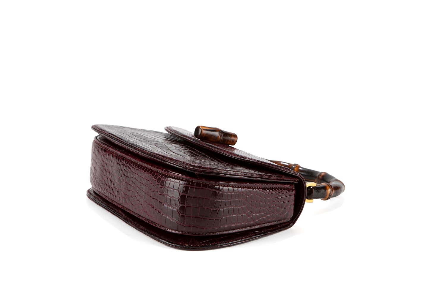 in pelle di coccodrillo color bordeaux con manico in bamboo curvato, anni '70, cm 26, con sacchetto, pre convenzione Cites (lievi difetti).