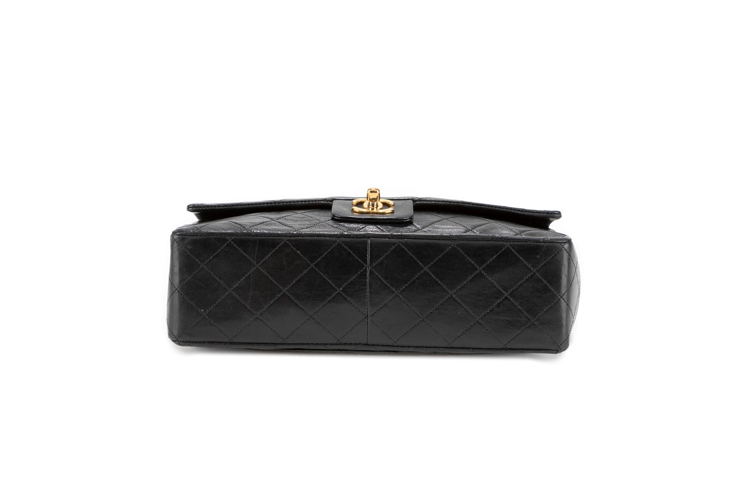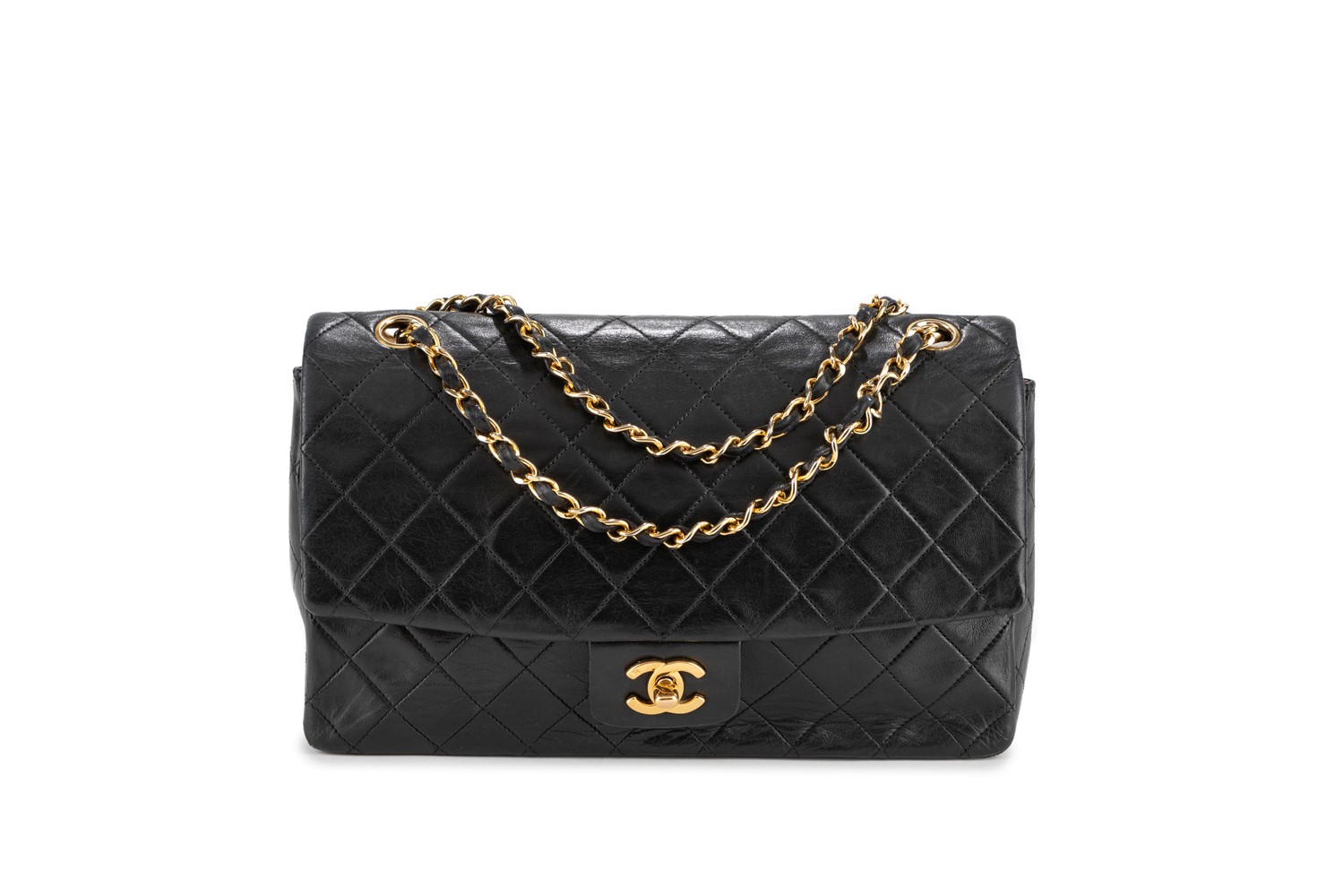 in pelle color nero matélassé, tracolla a catena e dettagli in metallo dorato, cm 27 (difetti).