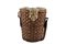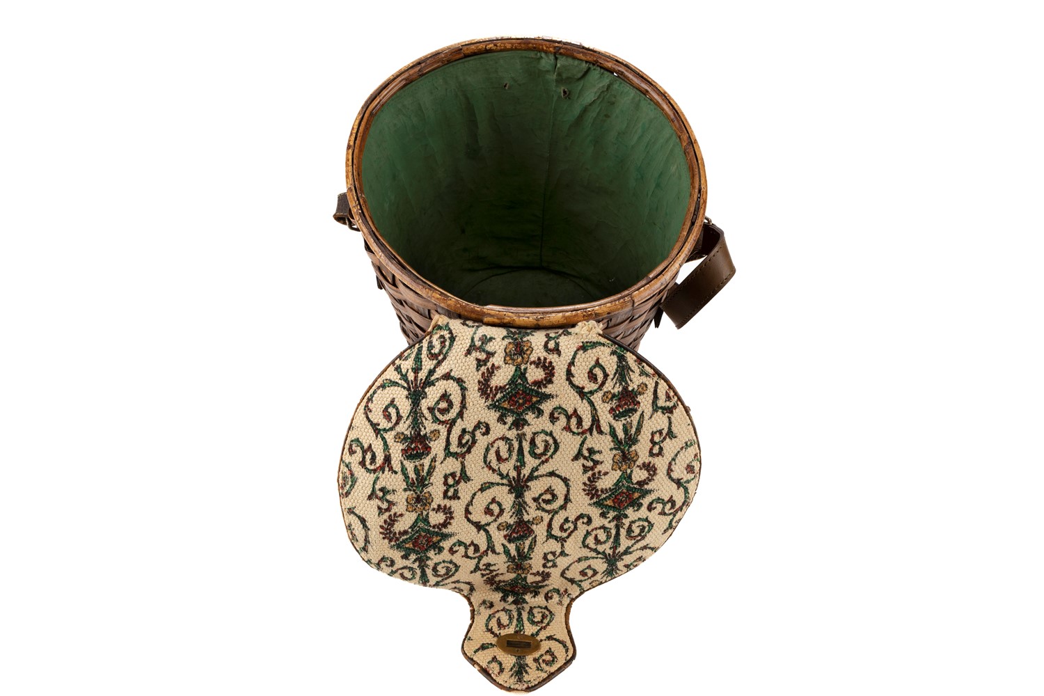 in paglia intrecciata con coperchio in tessuto stampato, interno rivestito in tessuto impermeabile color verde. Tracolla originale sostituita. Collezione Rinascimento, anni '50, cm 33x28 (difetti e mancanze).