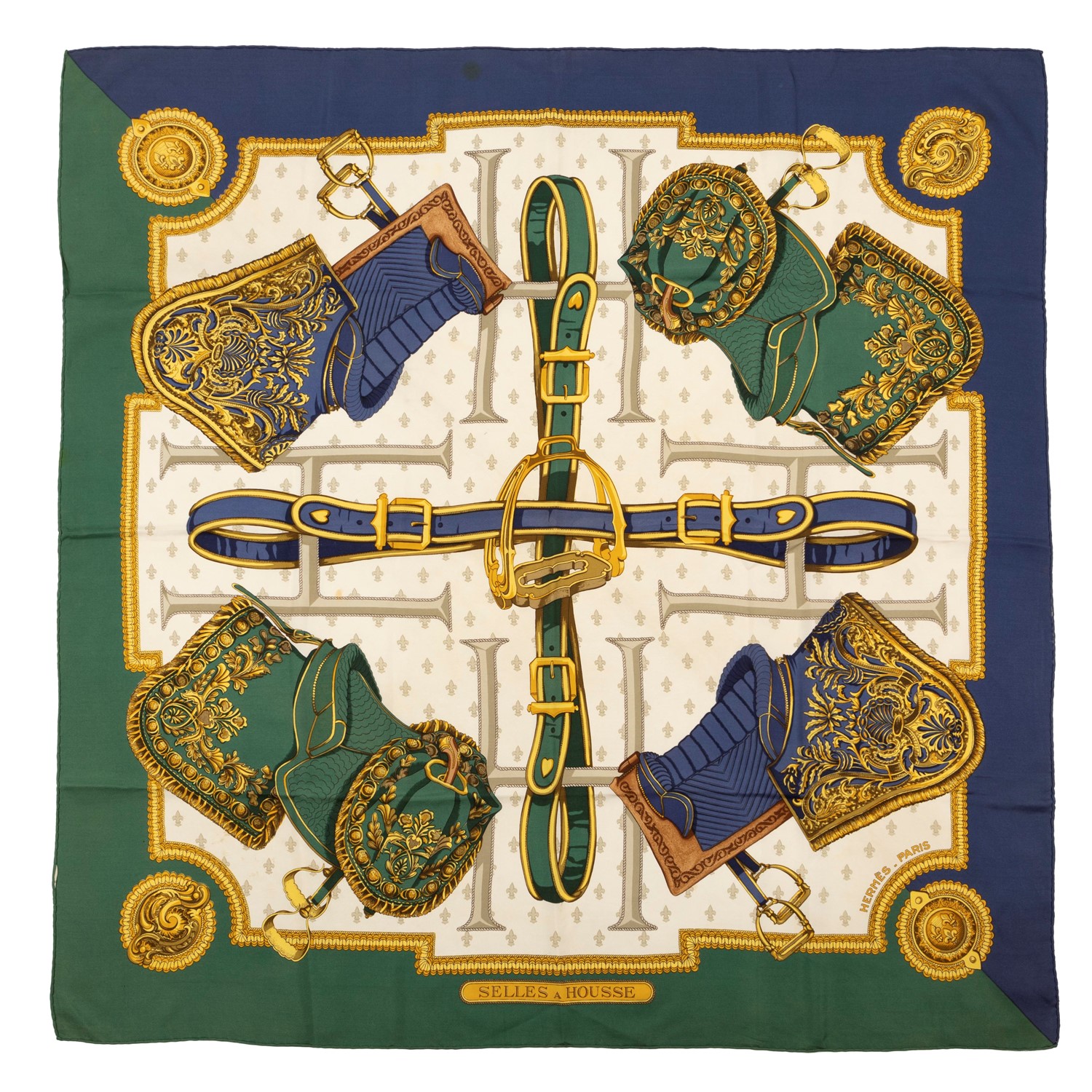 in seta su fondo color crema, bordo bicolore verde e blu notte, Christiane Vauzelles (difetti).