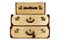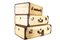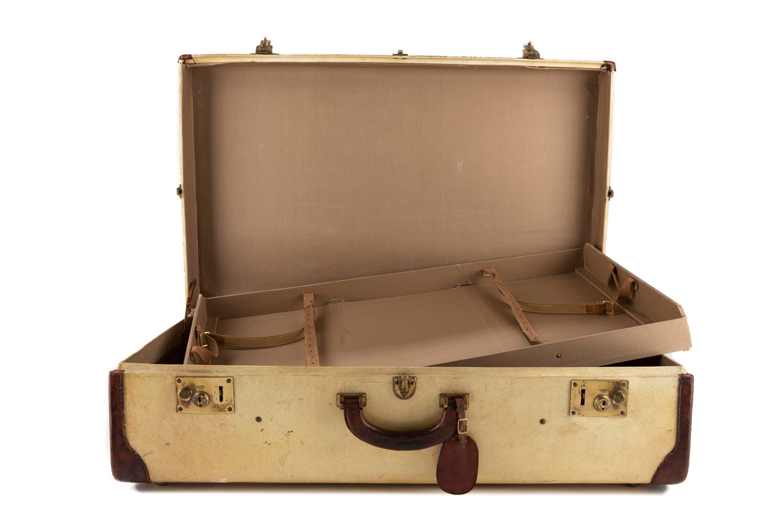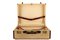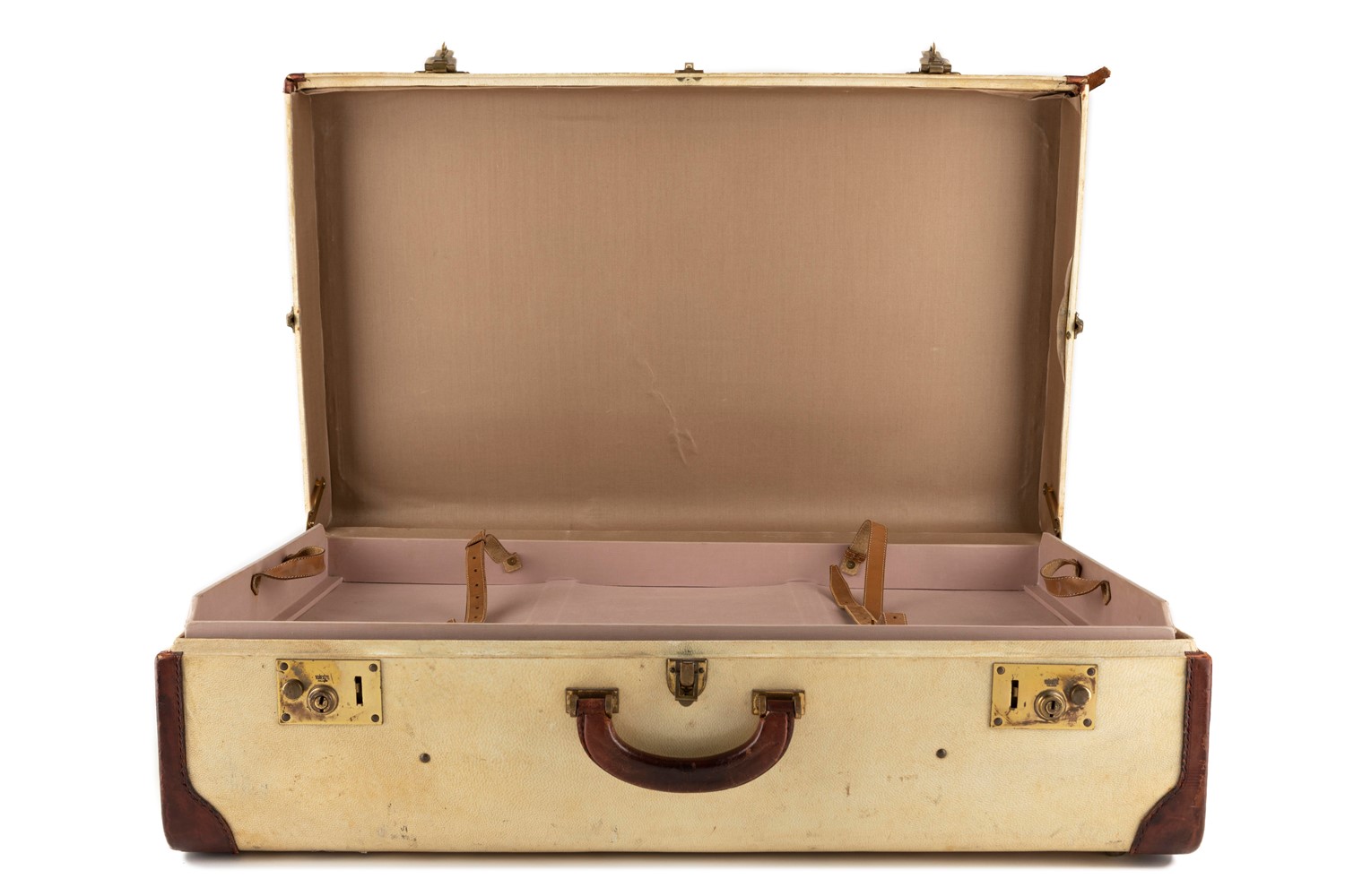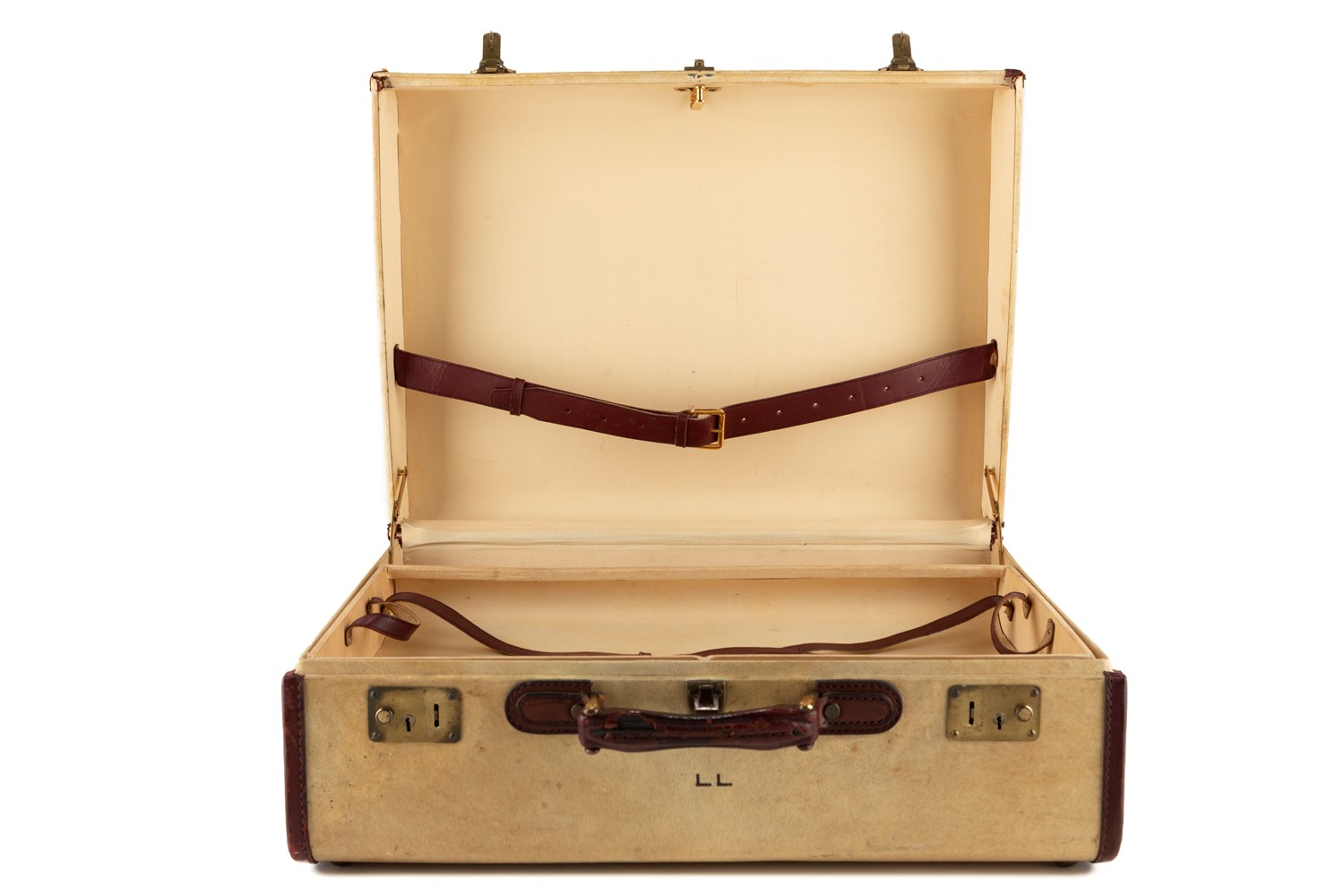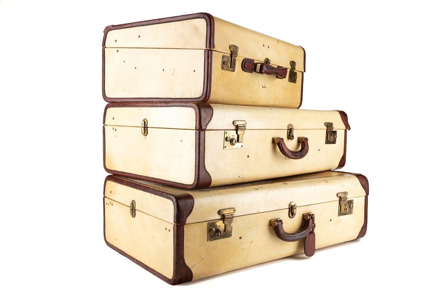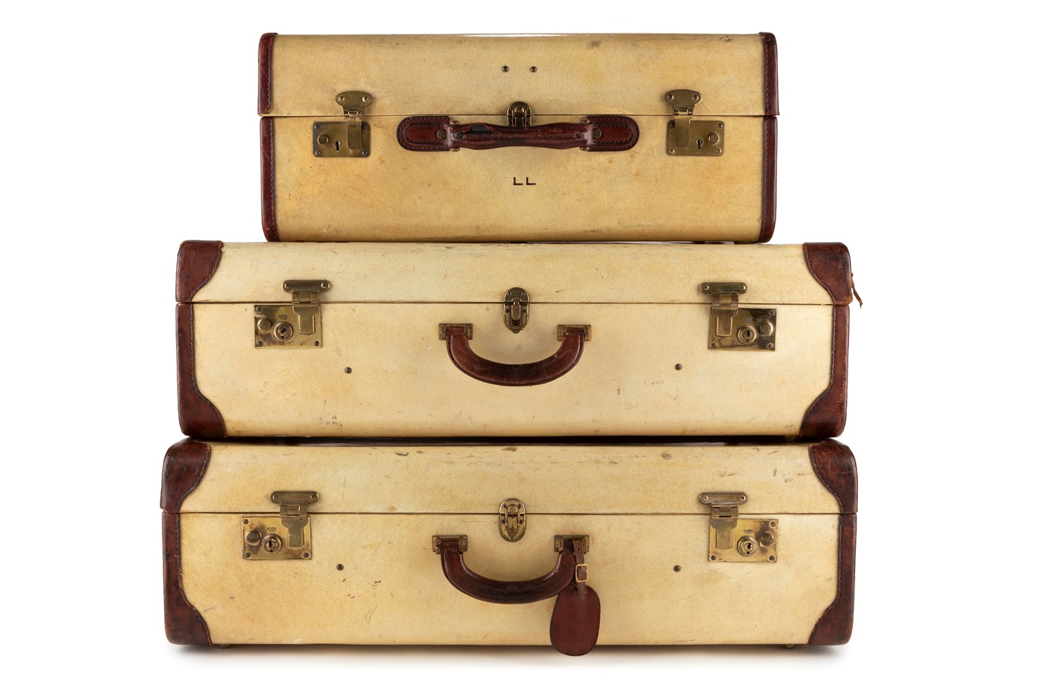 in pergamena con profili in cuoio, anni '70, cm 75x44x23 (una coppia) e cm 59x42x24,5 (singola) (difetti).