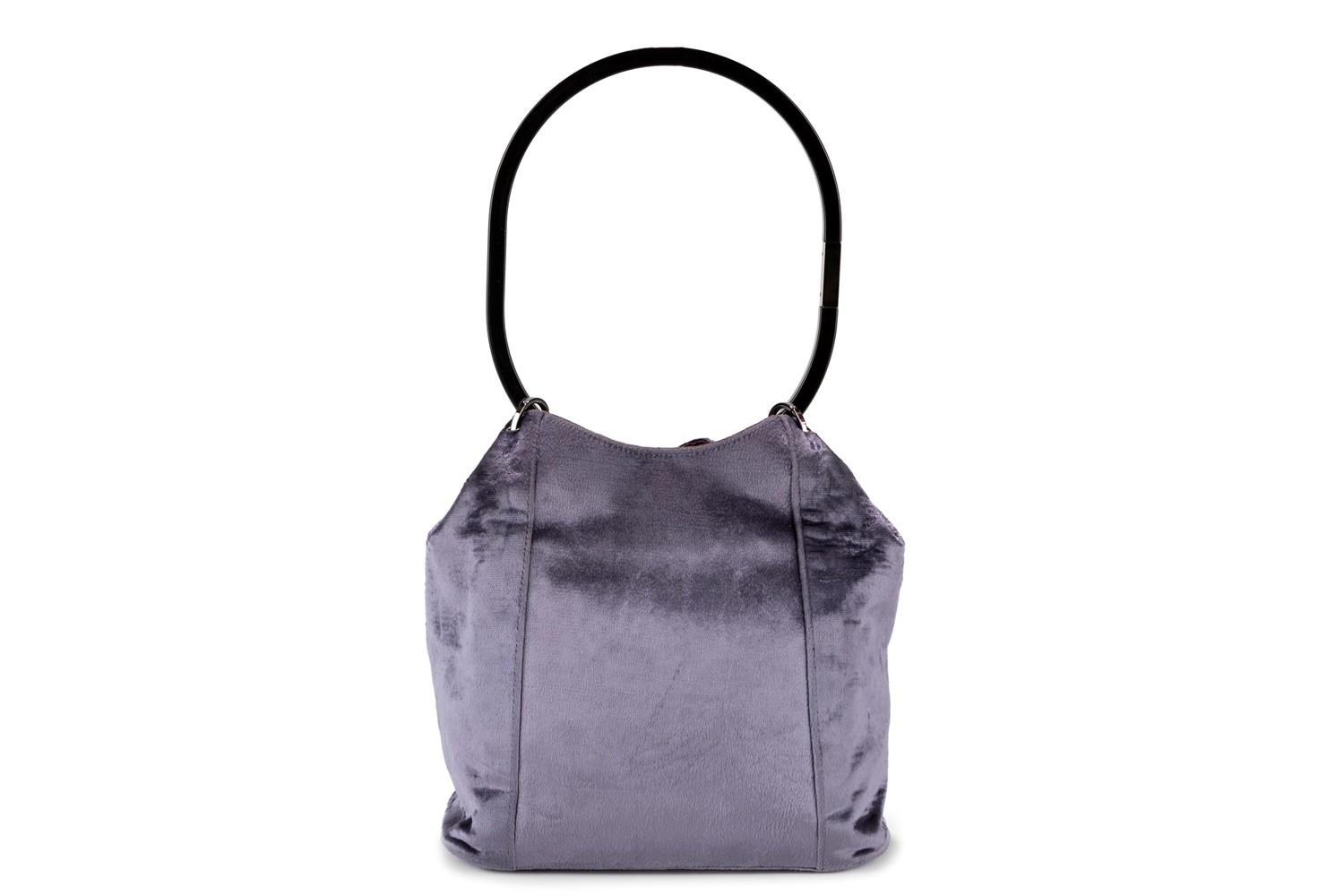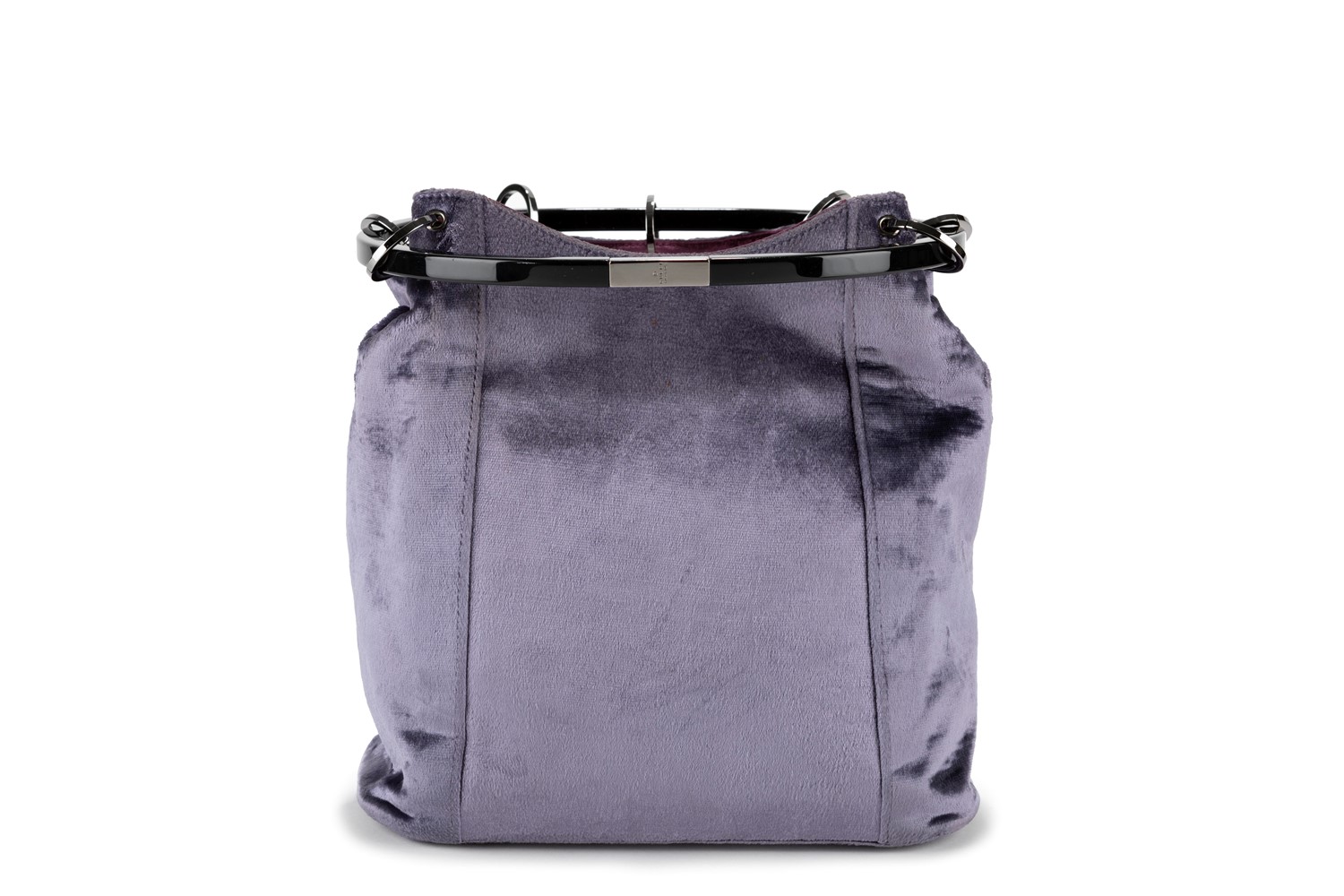in velluto di seta color prugna, manico ad anello, cm 24.