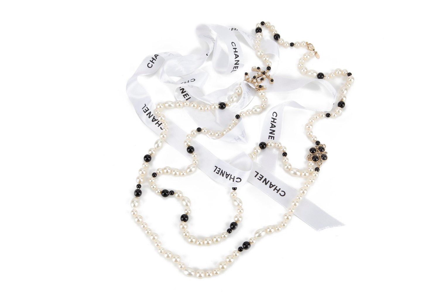 in pasta vitrea color nero, inserti in metallo dorato con strass, cm 112, con sacchetto e scatola.