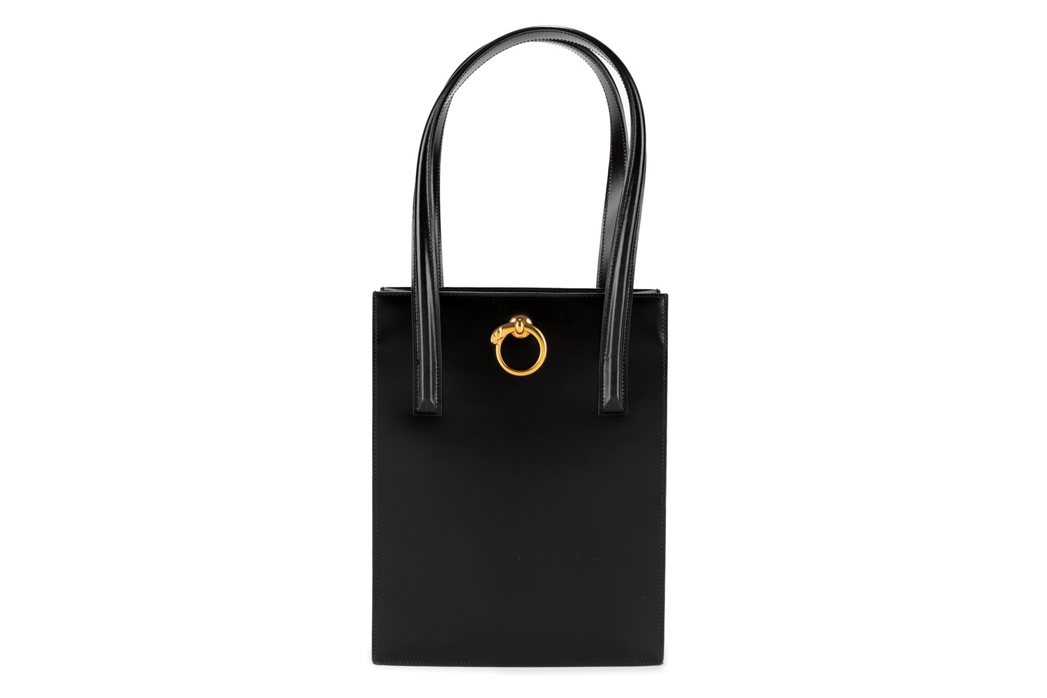 in pelle color nero, doppi manici, dettaglio Panthère in metallo dorato, cm 22 x 28 (lievissimi difetti).