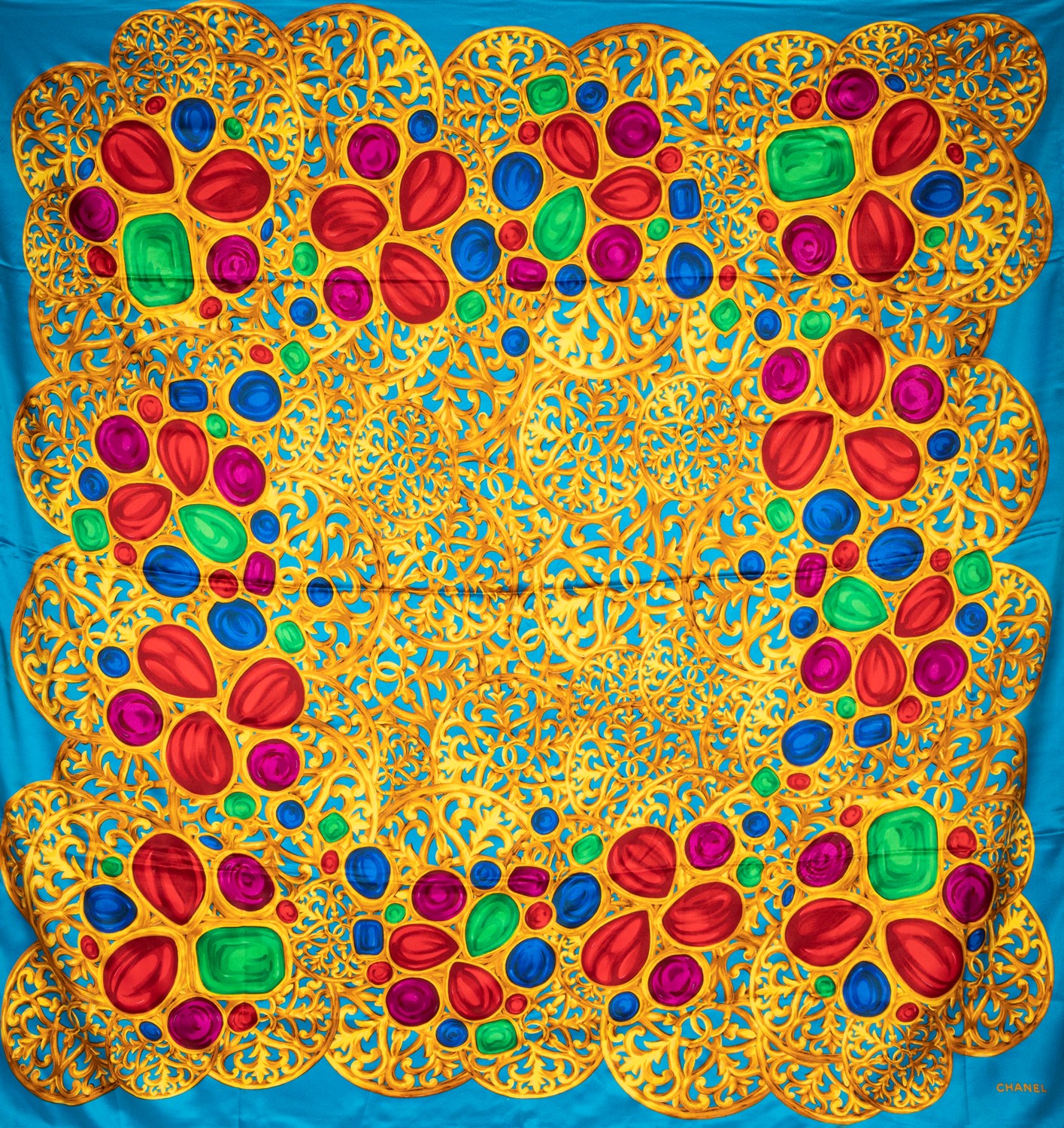 in seta stampa fantasia Gemme su fondo color turchese, cm 140x140.