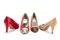 in pelle e raso di seta color miele e rosso, tacco 8, misura 7 e 8, un paio nuovo mai usato (difetti).