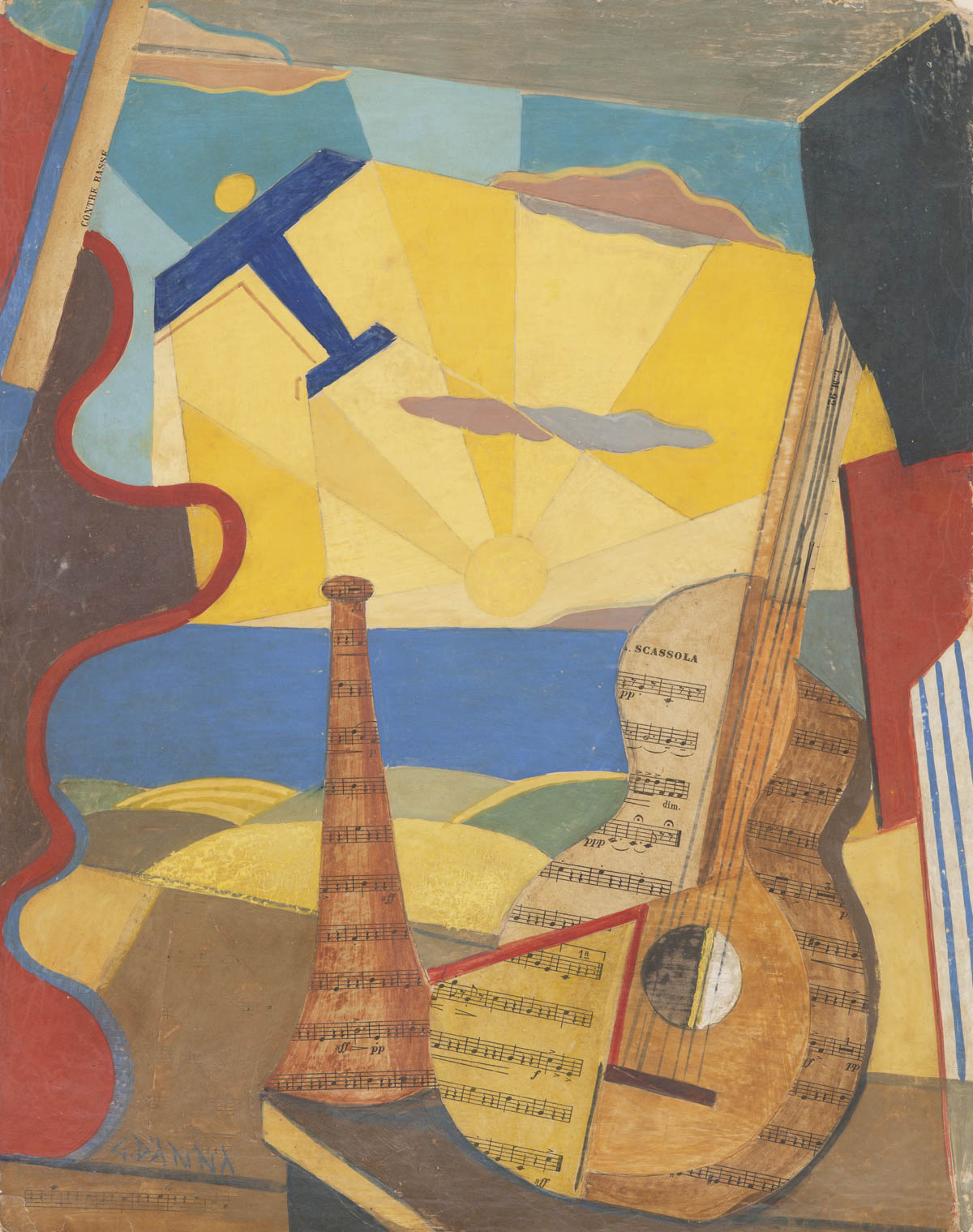 Giulio D’Anna (Villarosa 1908 – Messina 1978) Natura morta con aereo Caproni, 1929/30 ca.;Olio e collage su cartone, 51 x 40 cm, lievi strappi ai bordi