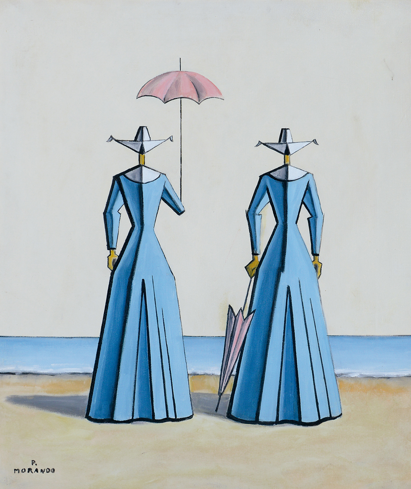 PIETRO MORANDO Alessandria 05/06/1889 - 24/09/1980  Suorine al mare olio su tela cm. 65x55, firma in basso a sinistra, autentica a cura di Pippo Pozzi al retro, archivio numero TL 1098 a cura della Galleria Soave (Al) su foto.