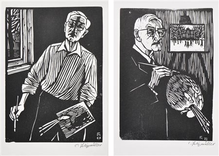Conrad Felixmüller (Dresden 1897 – Zehlendorf/Berlin 1977) Due autoritratti, 1967 o 1972;2 Xilografie, 17,2 x 11,4 cm; 16,7 x 11,7 cm (lastra)