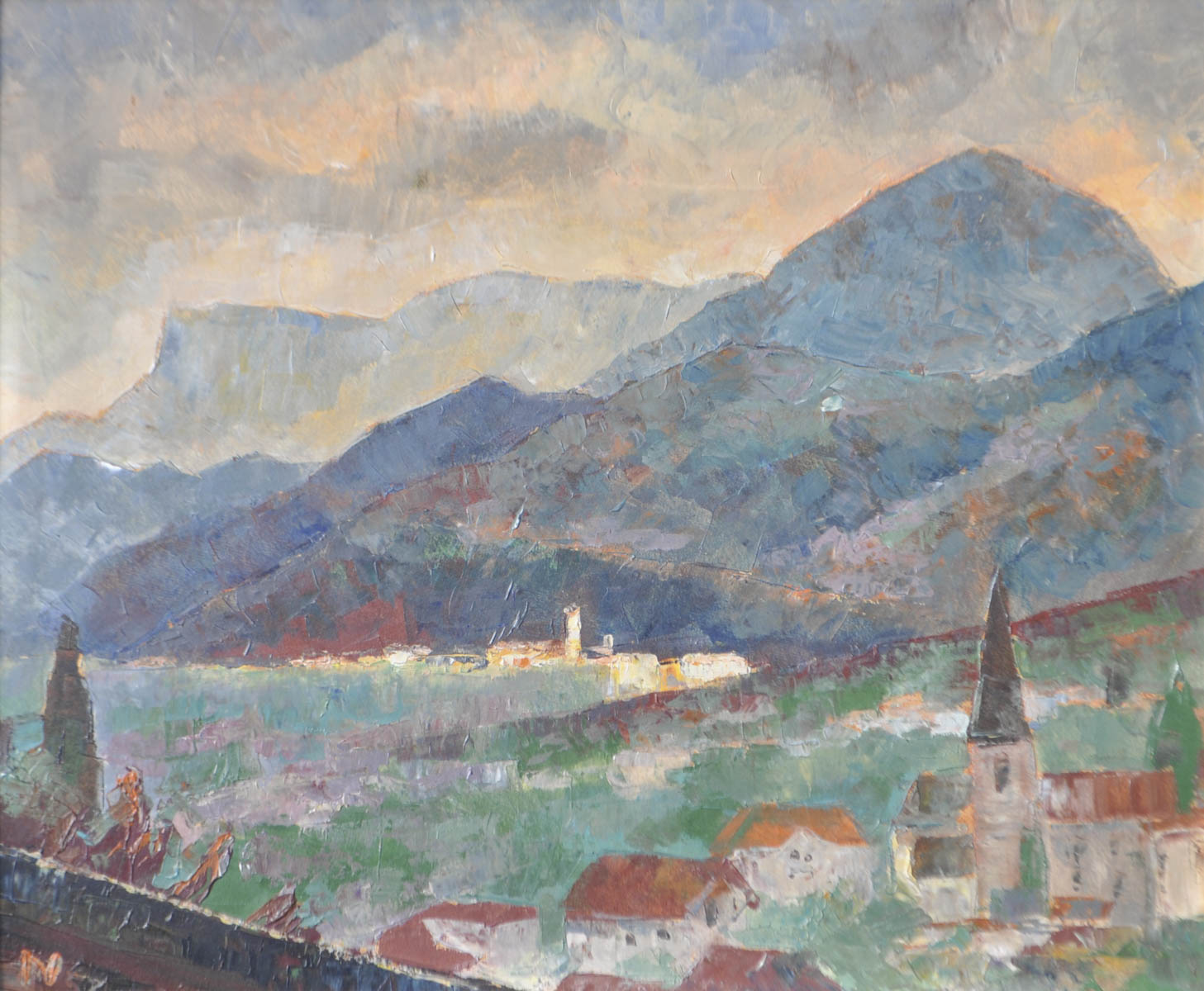 Ernst Nepo (Dauba, Böhmen/Boemia 1895 – Innsbruck 1971) Lana verso Mendola, 1952;Olio su cartone, 36 x 44 cm, in cornice