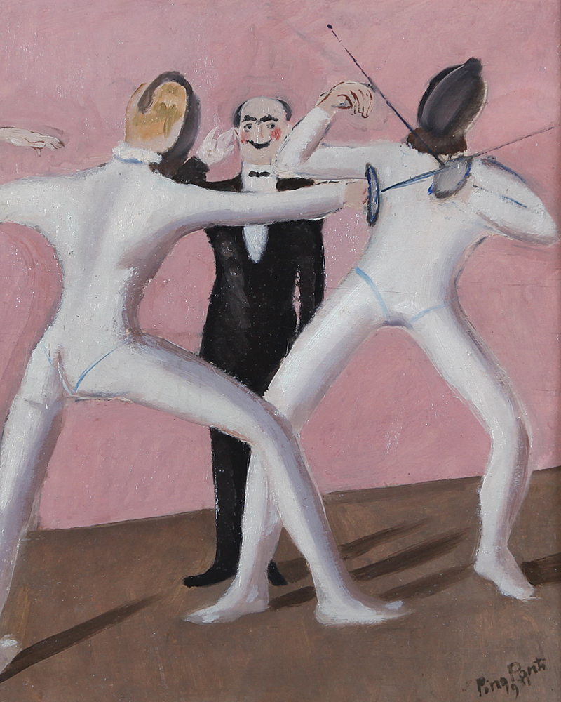 PINO PONTI Venezia 12/04/1905 - 1999  La scherma, 1931 olio su tavola cm. 50x40, firma e anno in basso a destra, etichette della Galleria Annunciata (MI) e della Mostra del Poligono, rivista internazionale d'arte, Galleria Milano (MI) giugno 1931 al retro.