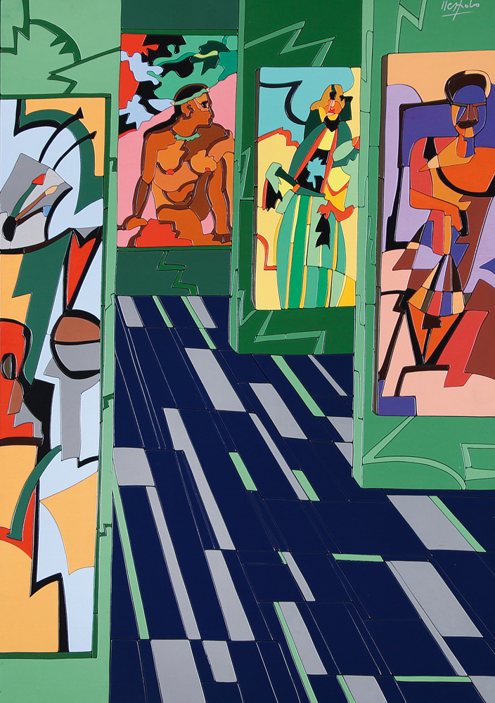 UGO NESPOLO Mosso Santa Maria (Bi) 29/08/1941  Museo/sogno esotico acrilico su legno cm. 100x70, firma in alto a destra, titolo, firma, tecnica, timbro a fuoco dell'artista ed etichetta della Galleria Arte 80 (Savigliano-CN) al retro, dichiarazione d'autenticità dell'artista su foto.