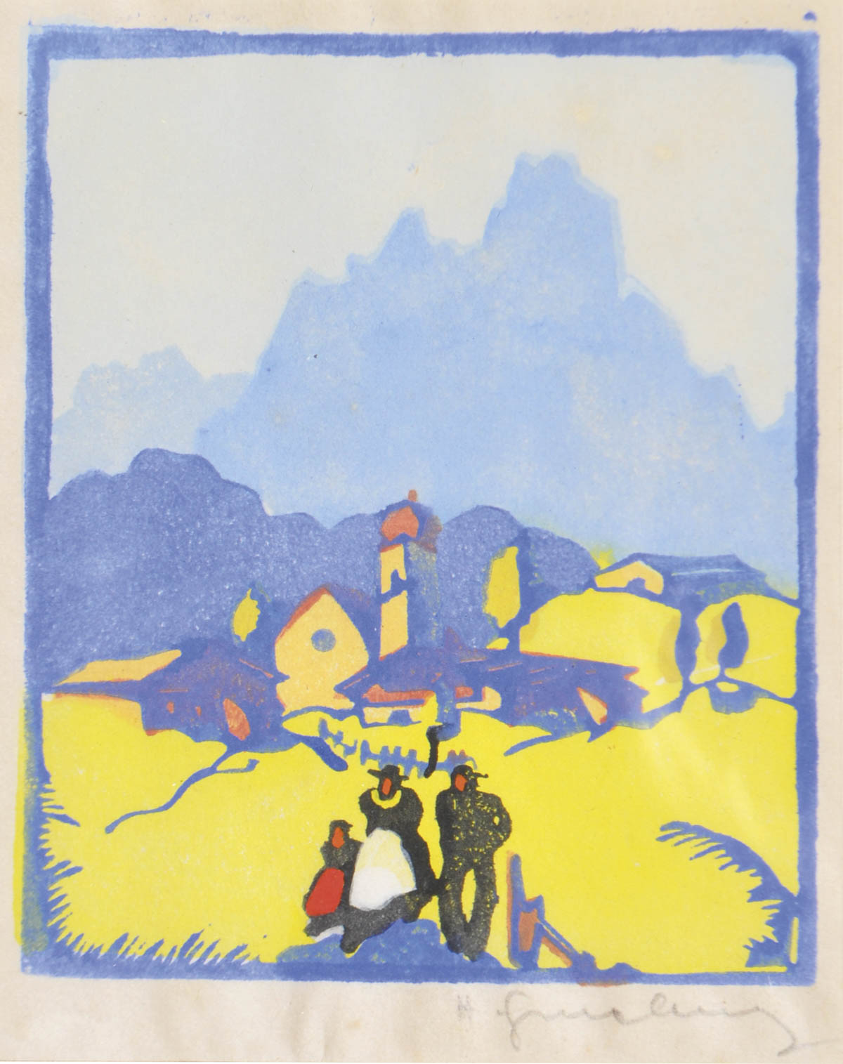 Herbert Gurschner (Innsbruck 1901 – London/Londra 1975) Di ritorno, Tirolo;Xilografia a colori, 12,5 x 10,5 cm (immagine)
