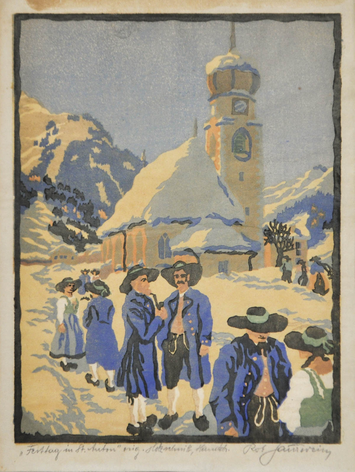 Robert Saurwein Giornata di festa a St. Anton;Xilografia a colori, 26 x 19,5...
