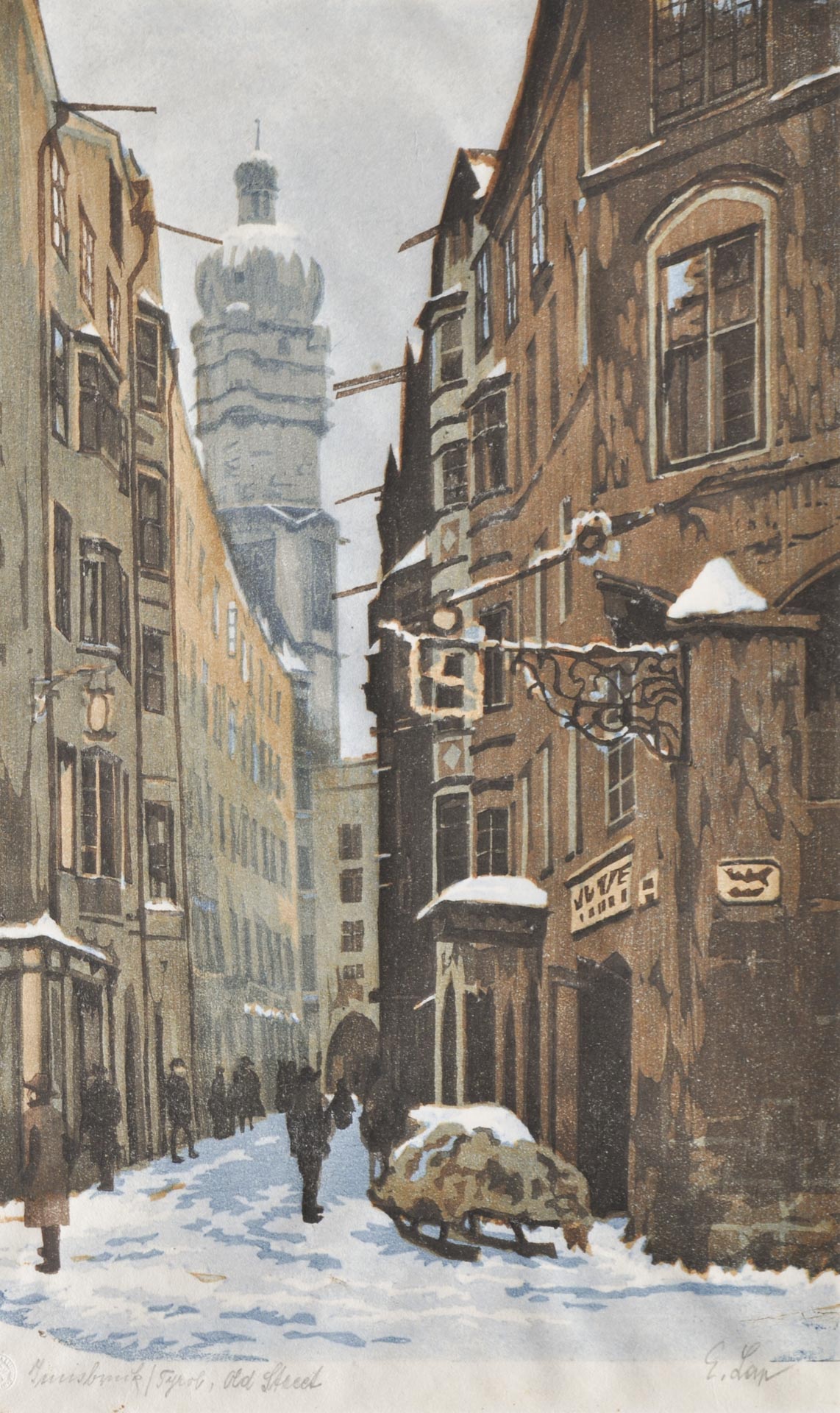 Engelbert Lap Città vecchia di Innsbruck in inverno, 1924;Xilografia a colori, 27 x 17 cm (immagine)