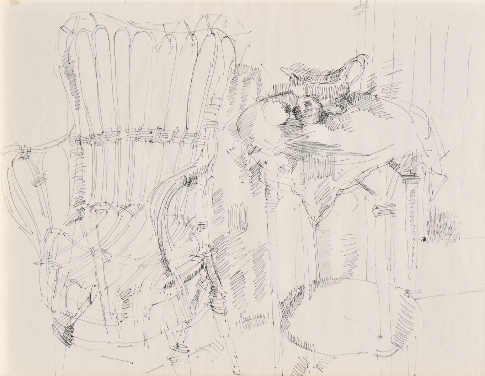 Anton Tiefenthaler (Hall in Tirol 1929 – Innsbruck 1982) Sedia in vimini e tavolino;China, 46 x 60,5 cm, in cornice