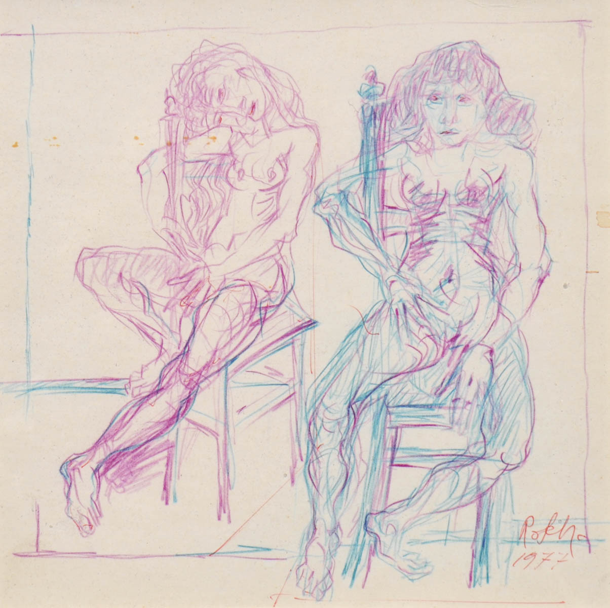 Robert Scherer (*Kortsch/Corces 1928) Due nudi seduti, 1977;Matite colorate, 20,3 x 20 cm, in cornice