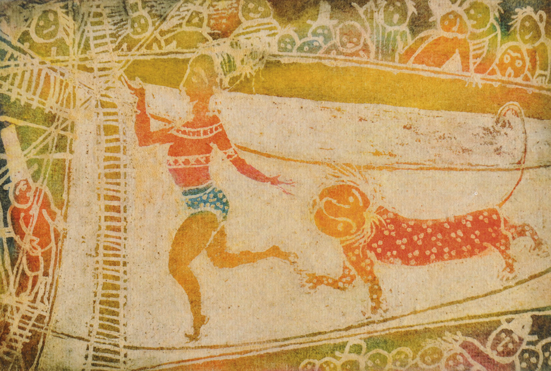 Vladislav Kavan (Baska 1924 – Bozen/Bolzano 2005) Leone con artista del circo, 1971;Tecnica mista su cartone su tavola, 13 x 19,3 cm, in cornice