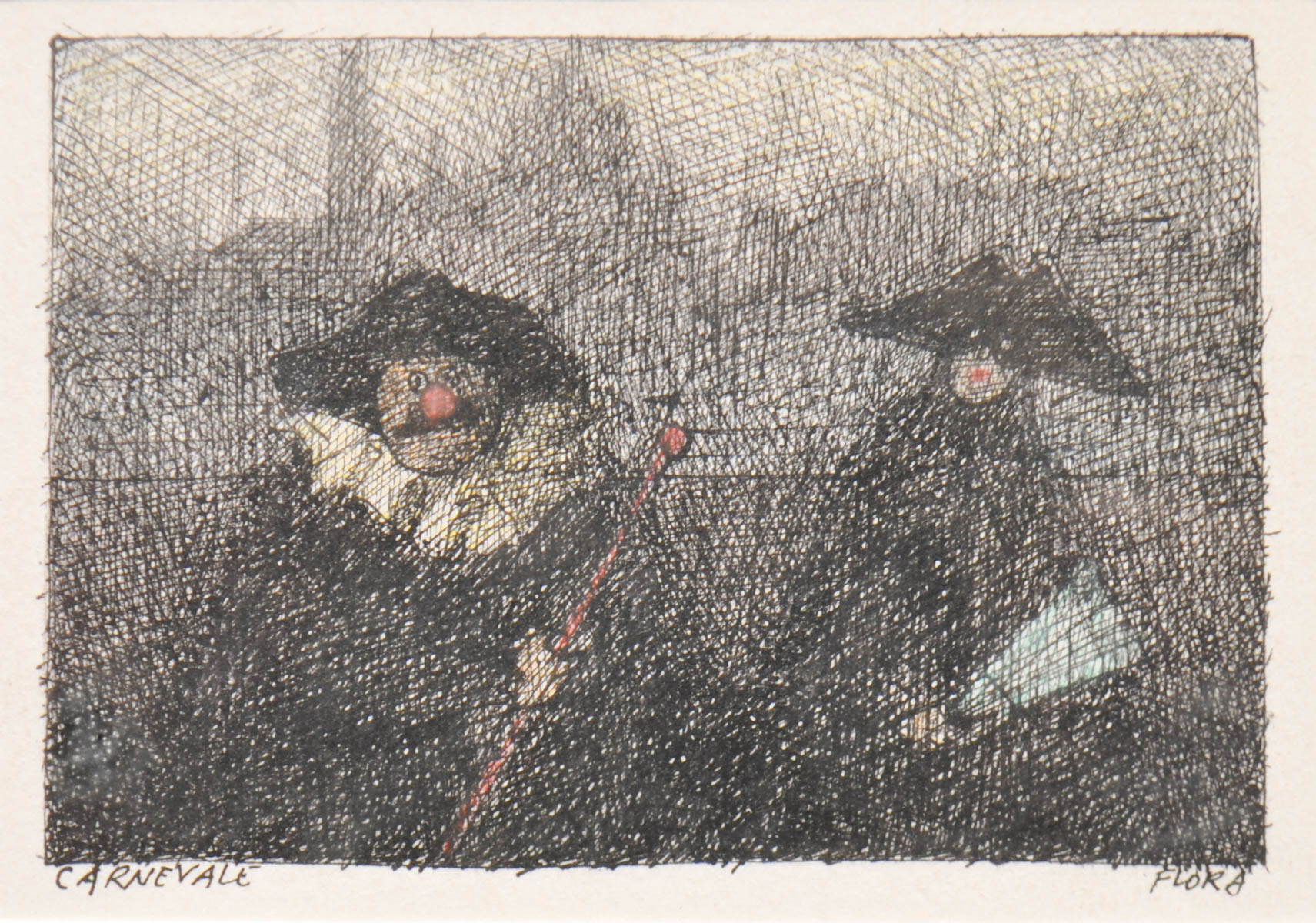 Paul Flora (Glurns/Glorenza 1922 – Innsbruck 2009 Carnevale;China, colorata, 7,2 x 8,8 cm, in cornice