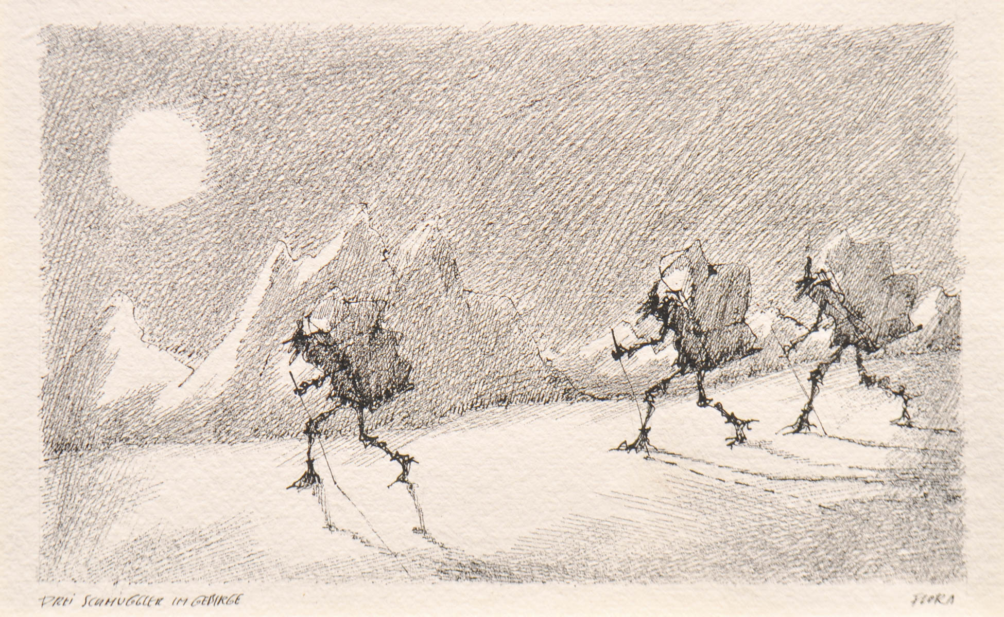 Paul Flora (Glurns/Glorenza 1922 – Innsbruck 2009) Tre contrabbandieri tirolesi;China, 14 x 21,7 cm (entro il passepartout)