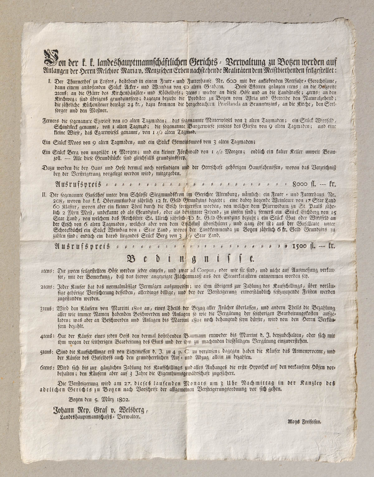 - Circolare “Versteigerung Realitäten..;Erben von Melchior Maria von Menz“,