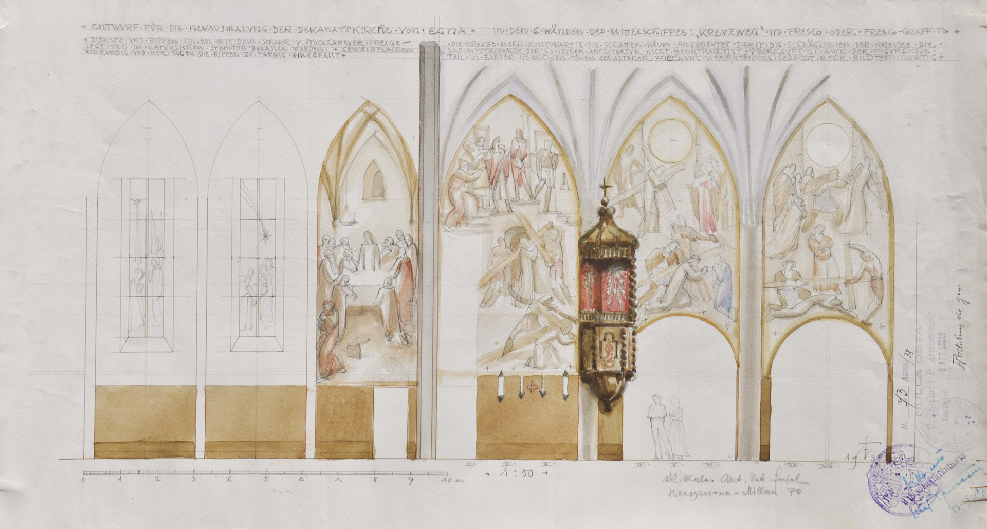 Anton Sebastian Fasal 3 bozzetti per la chiesa a Egna, 1938;Matita, acquerello, 30 x 55 cm, 30 x 55 cm, 55 x 76