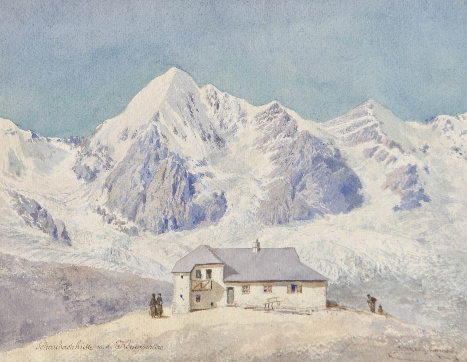 Adolf Albin Blamauer (Wien/Vienna 1847 – 1923) Rifugio Città di Milano con Gran Zebru, gruppo Ortles-Cevedale;Aquarell, 23,2 x 30 cm, gerahmt