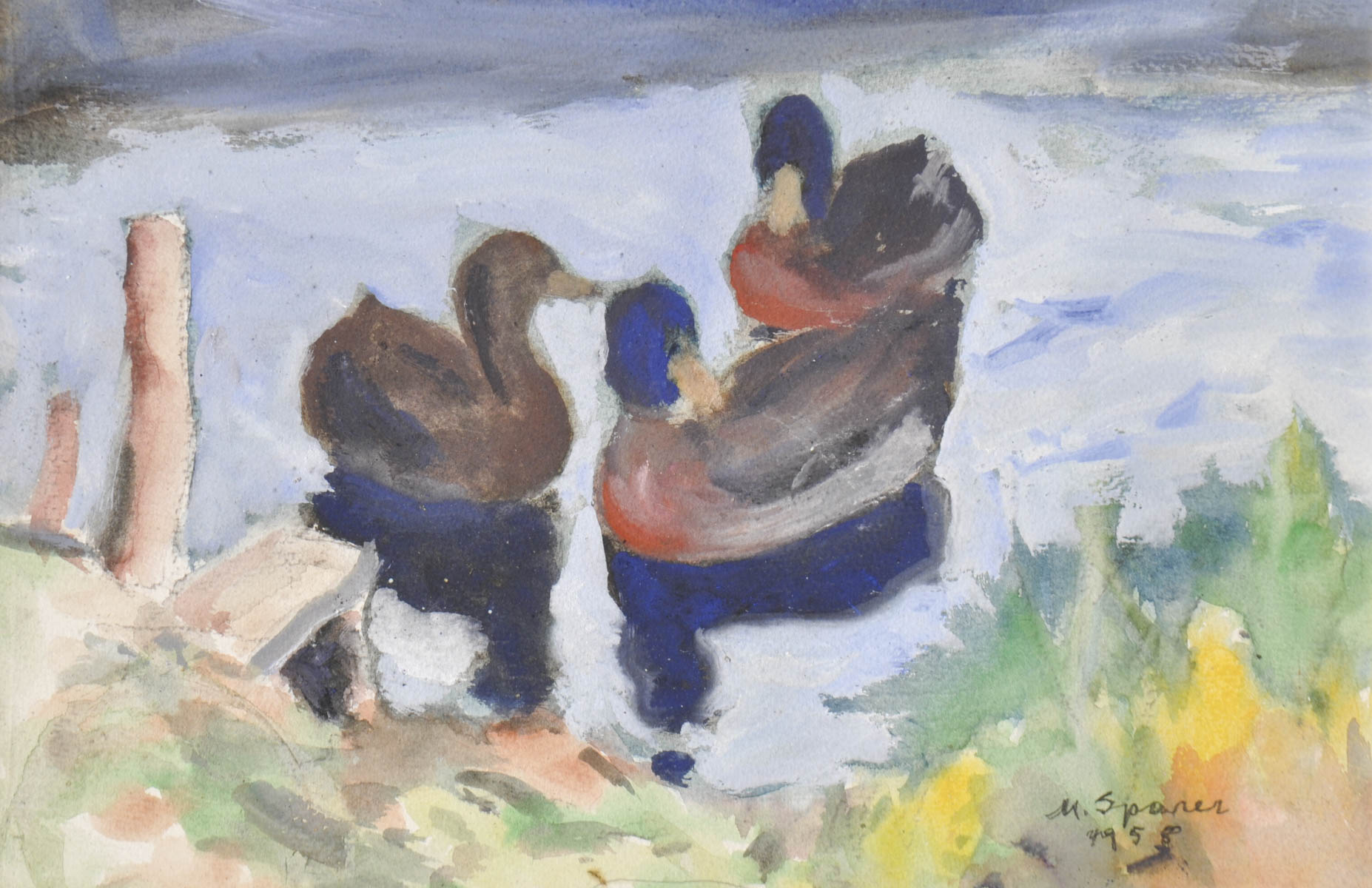 Max Sparer (Söll, Tramin/Termeno 1886 – Bozen/Bolzano 1968) Anatre in riva, 1958;Acquerello, 31,5 x 46,5 cm, in cornice