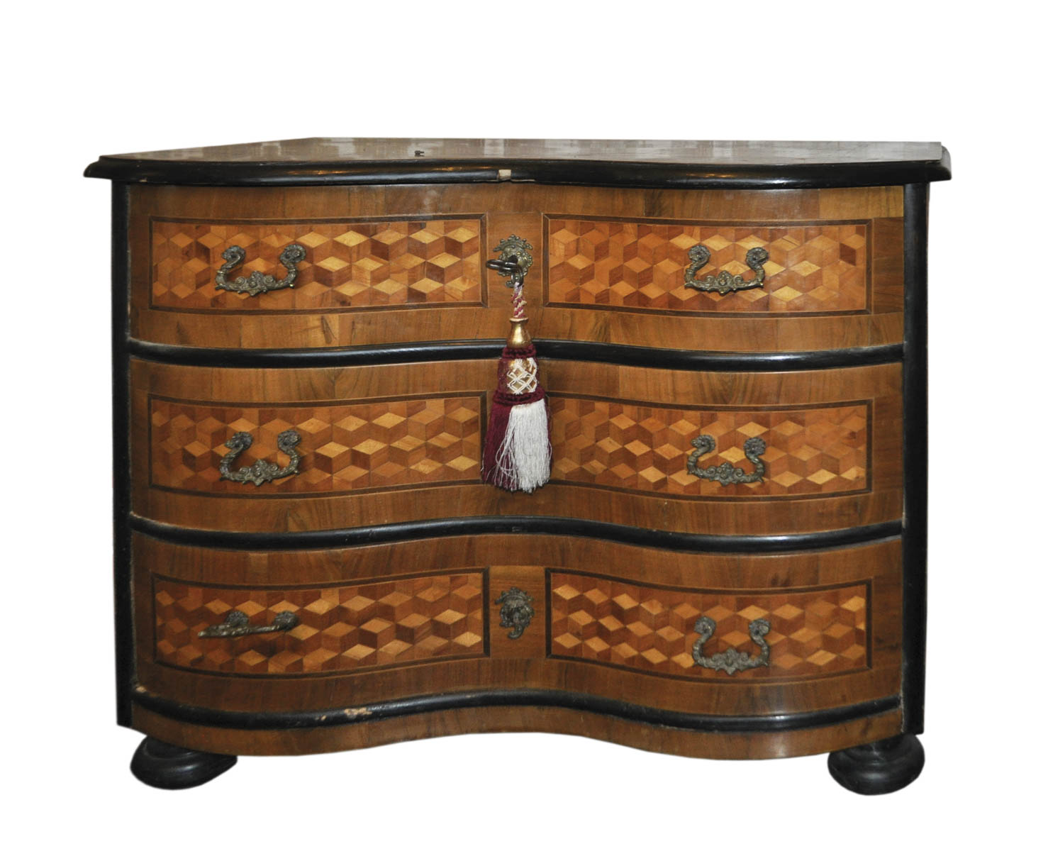 - Comò barocco, XVIII sec.; Legno intarsiato, disegno a quadretti, 86 x 97 x...
