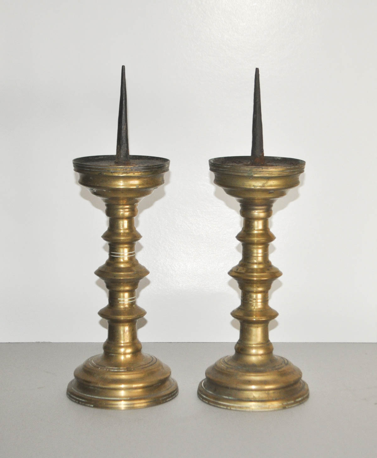 - 2 candelieri, XVII sec.;Ottone, altezza 37 cm ca. con spina
