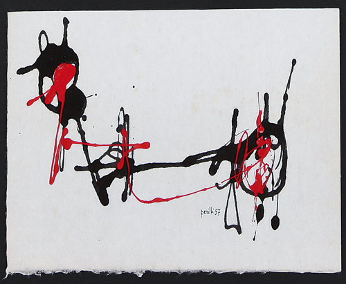 ACHILLE PERILLI Roma 28/01/1927 Senza titolo, 1957 smalto su carta Japon cm. 26,5x34,5; firma e anno in basso al centro, il disegno è contenuto nel libro "Il pescatore di miti" di Achille Perilli e Carla Vasio, dichiarazione d'autenticità e archivio dell'artista su foto.