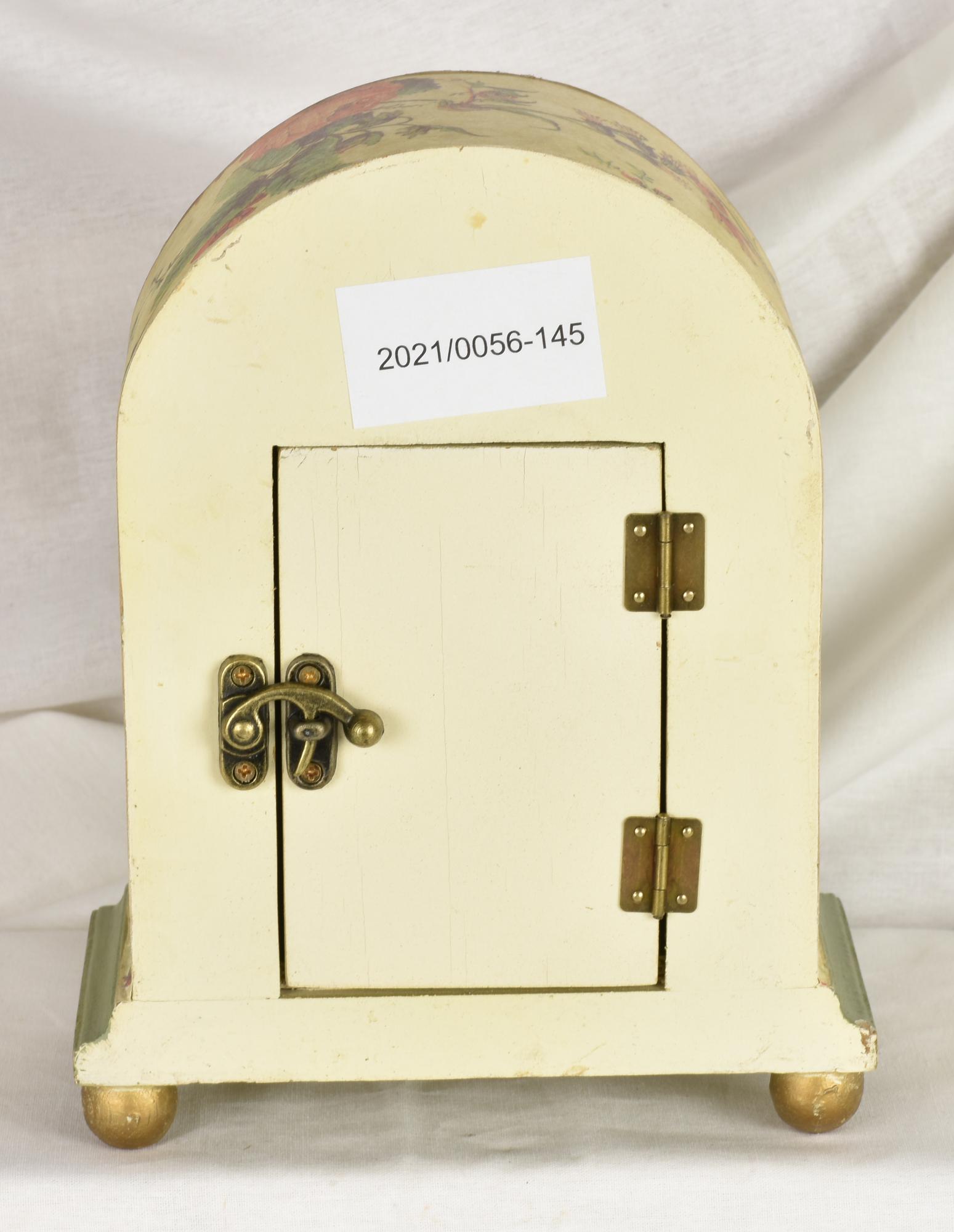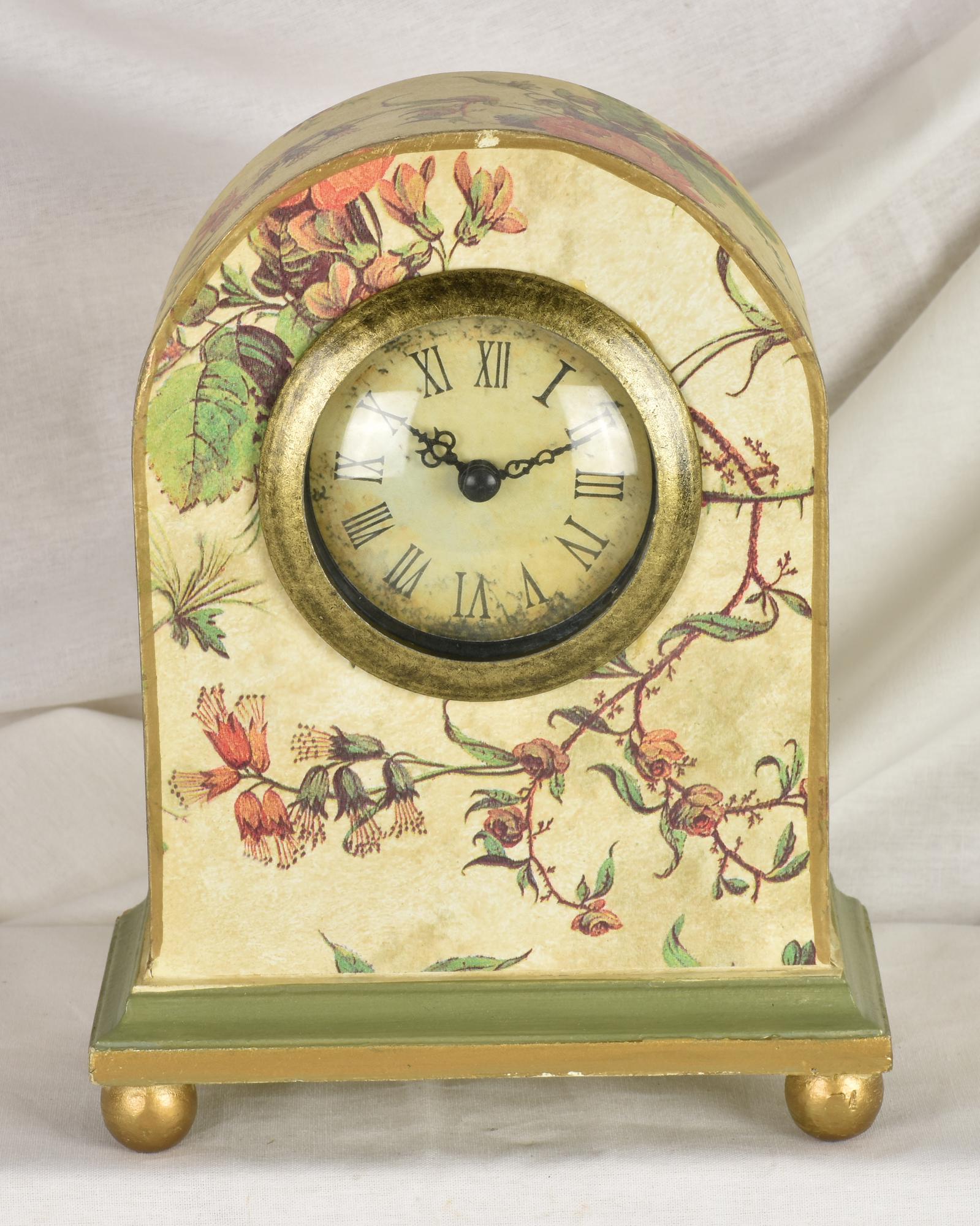 OROLOGIO DA TAVOLO con cassa in legno decorata a decoupage con motivi...