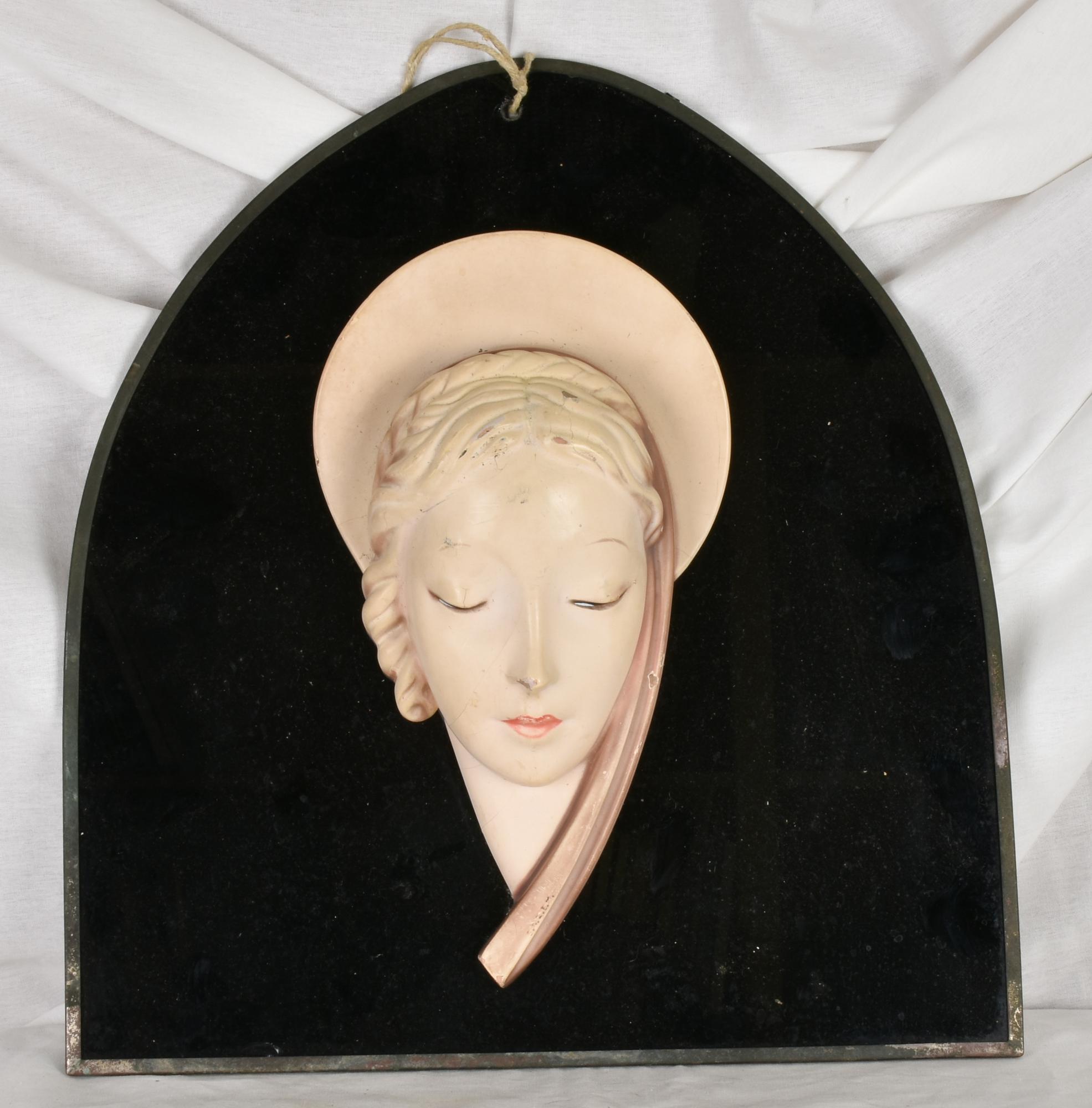 SCULTURA IN CERAMICA raffigurante la Beata Vergine montato su vetro nero...