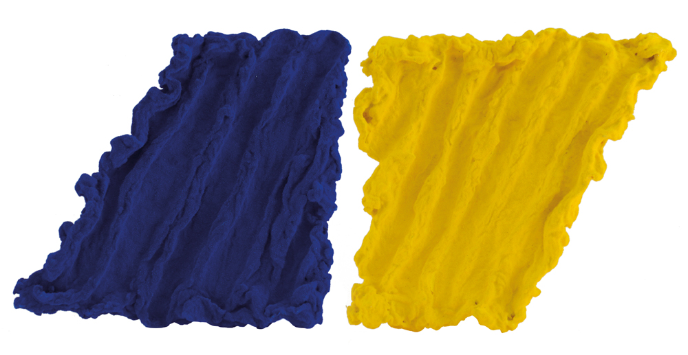 PINO PINELLI Catania 01/10/1938 Pittura BL.G., 1995 dittico di elementi giallo blu cm. 26x27 cadauno (totale cm. 26x54), firma, titolo e anno sul 1° elemento, dichiarazione d'autenticità dell'artista su foto, opera priva di cornice.