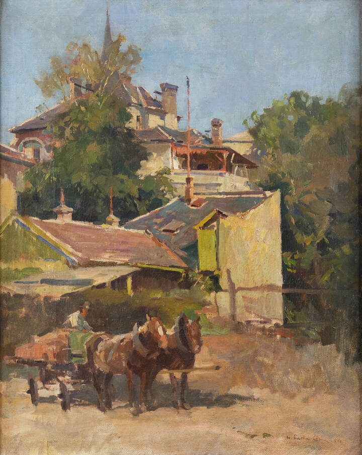 "Paesaggio con case e carro con cavalli"