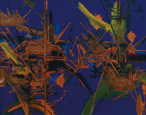 GEORGES MATHIEU Boulogne sur Mer 1921 - Boulogne-Bilancourt 12/06/2012 Traces futiles, 1986 olio su tela cm. 74x92, firma e anno in basso a destra, titolo al retro sul telaio.