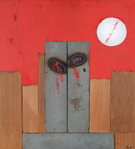 PIERLUIGI DE LUTTI Monfalcone 1959 Doppia ferita A5, 2001 acrilico, legni e metallo con combustioni applicati su tavola cm. 100x90, firma in basso a destra, firma, titolo e dedica dell'artista ad personam al retro, dichiarazione d'autenticità dell'artista su foto.