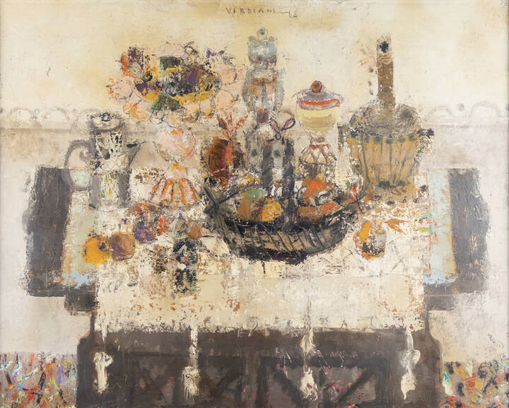 LUCIANO VERDIANI<BR>Torino 1929 - 1992<BR>"Natura morta su vecchio mobile" 1964